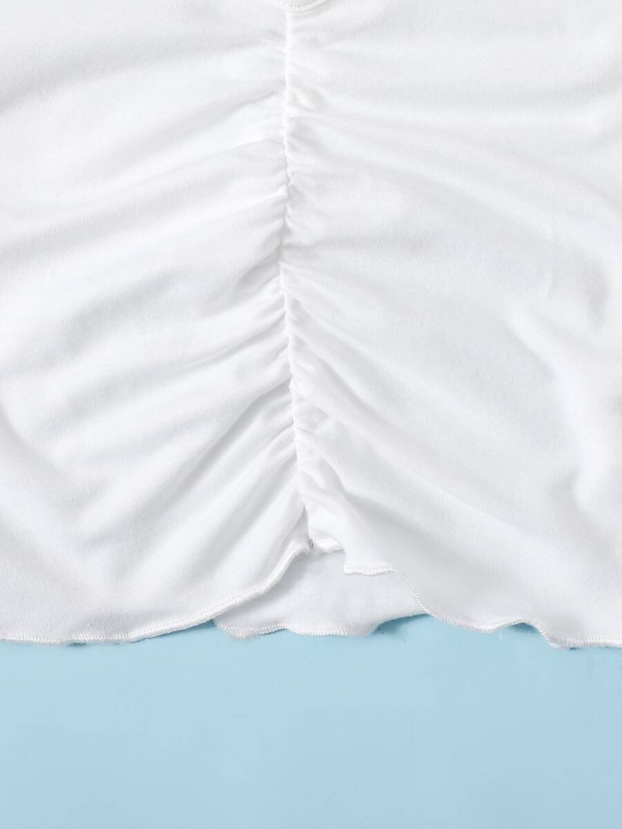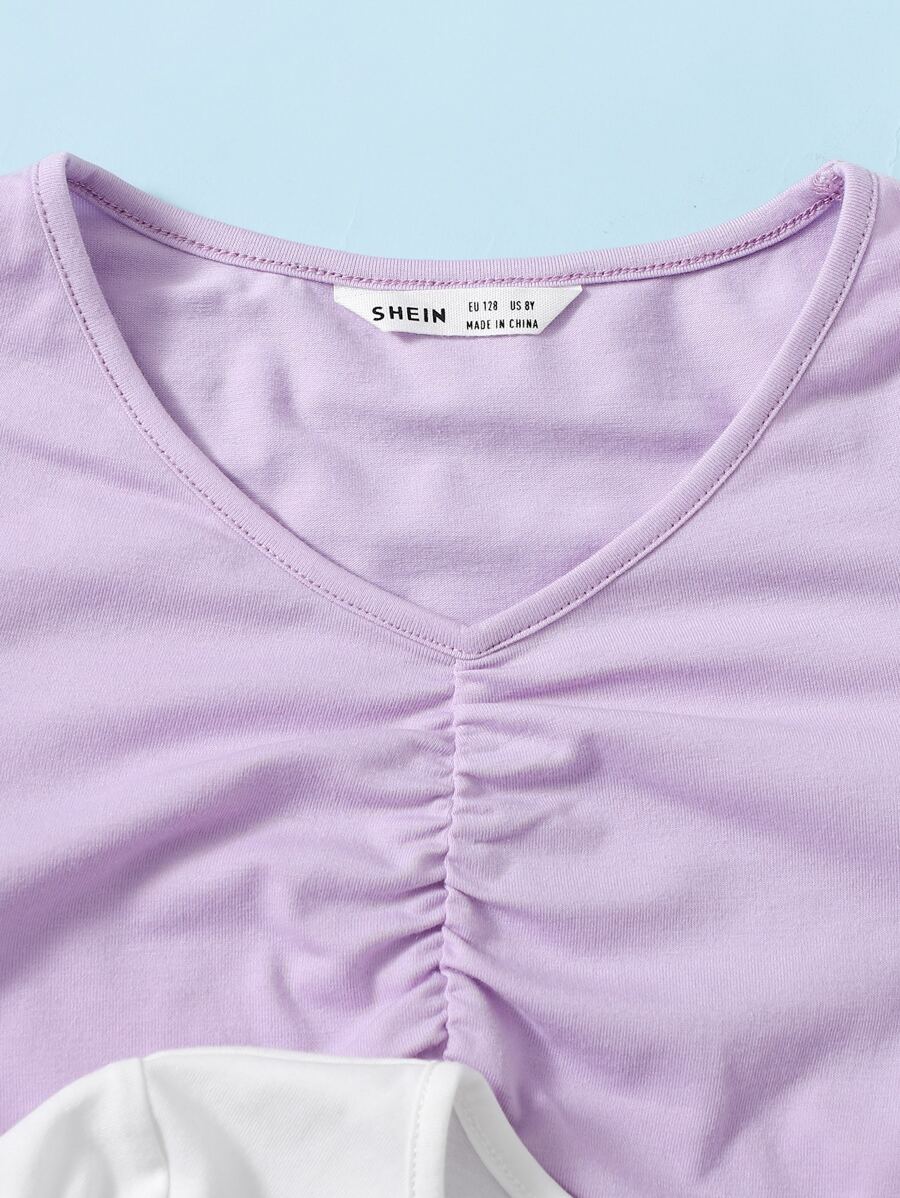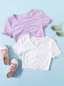 فتاة مراهقة تي شيرت كشكش محبوك بياقة على شكل حرف V بعبوتين