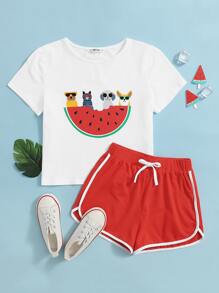 طقم سروال قصير دولفين بربطة خصر مع تي شيرت جرافيك رسوم كارتون للبنات