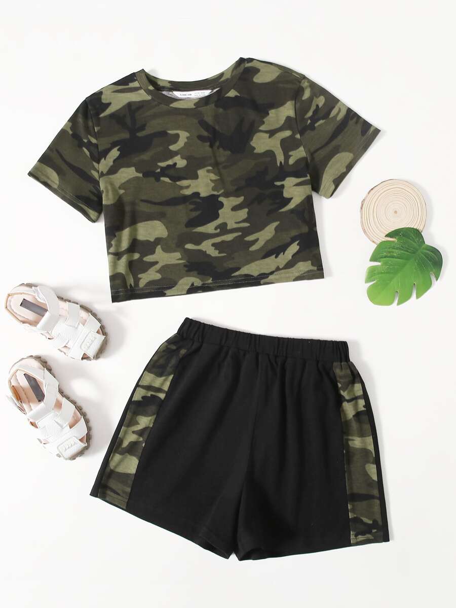 طقم شورت تريك مع مع تي شيرت بطباعة مموه للبنات