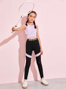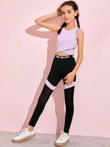 طقم ليقينز بإدخال شبكي بشريط بشعار مع لباس علوي بدون اكمام متقاطع للبنات