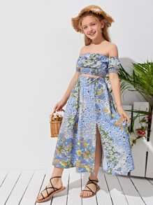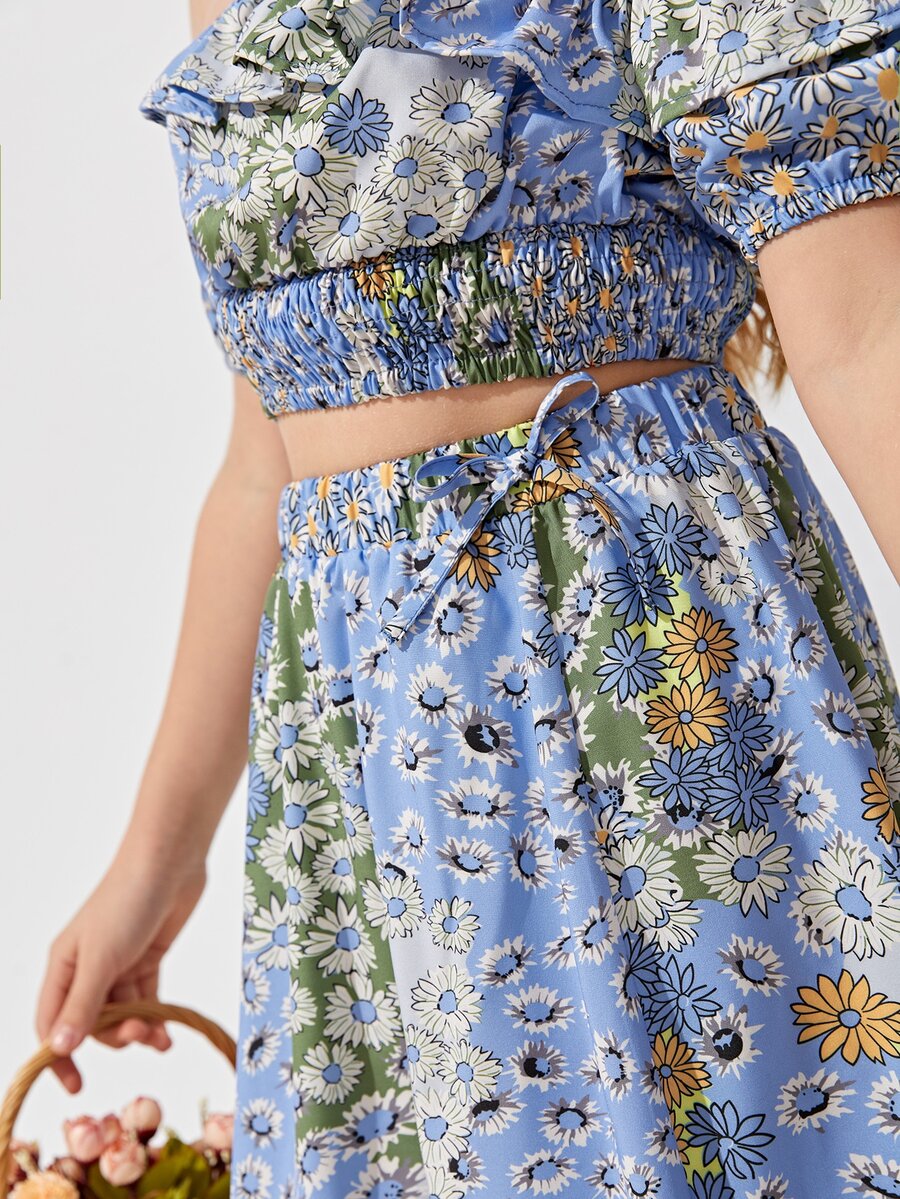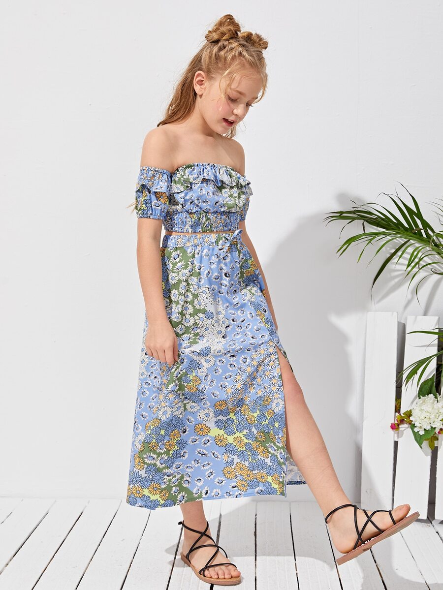 طقم تنورة بحافة فتحة مع لباس علوى بكتف مكشوف بزهر أقحوان للبنات