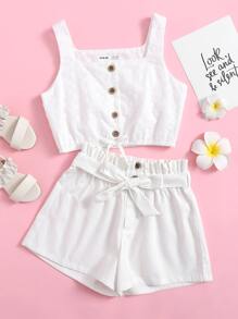 طقم شورت بحزام خصر جيب ورقي مع لباس علوي تانك مطرز بفتحات للبنات
