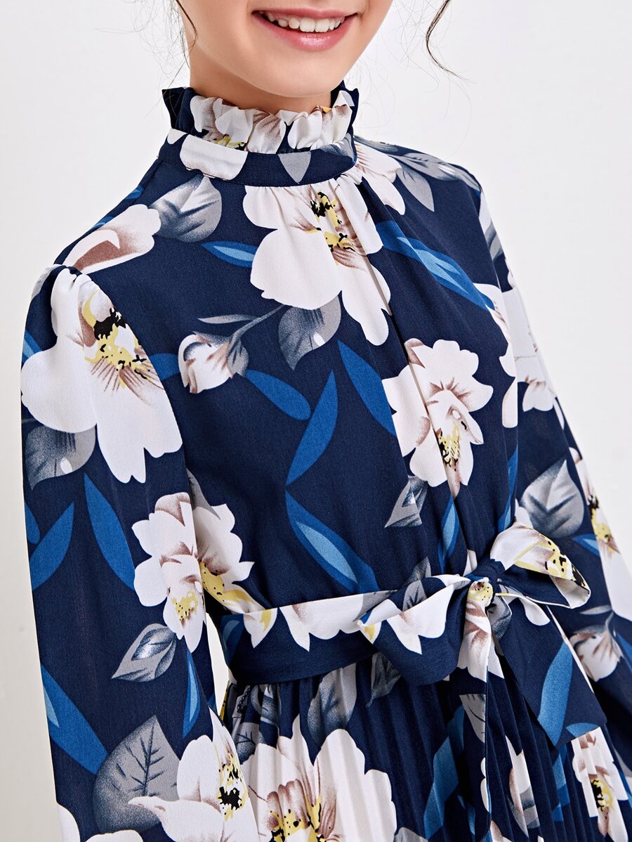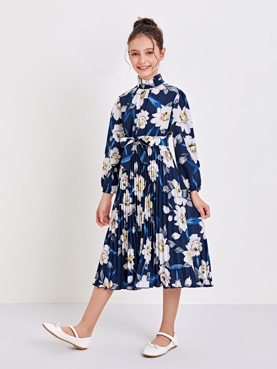 فستان ملائم بطباعة زهر بحزام ذاتي وبعنق مكشكش للبنات