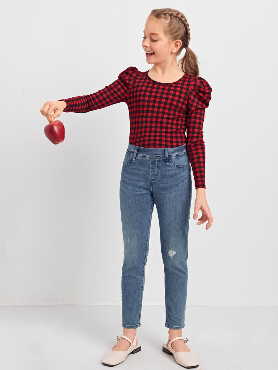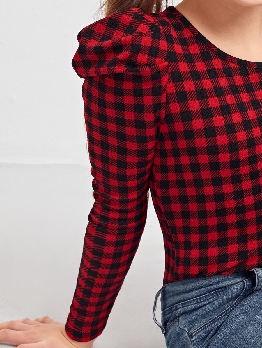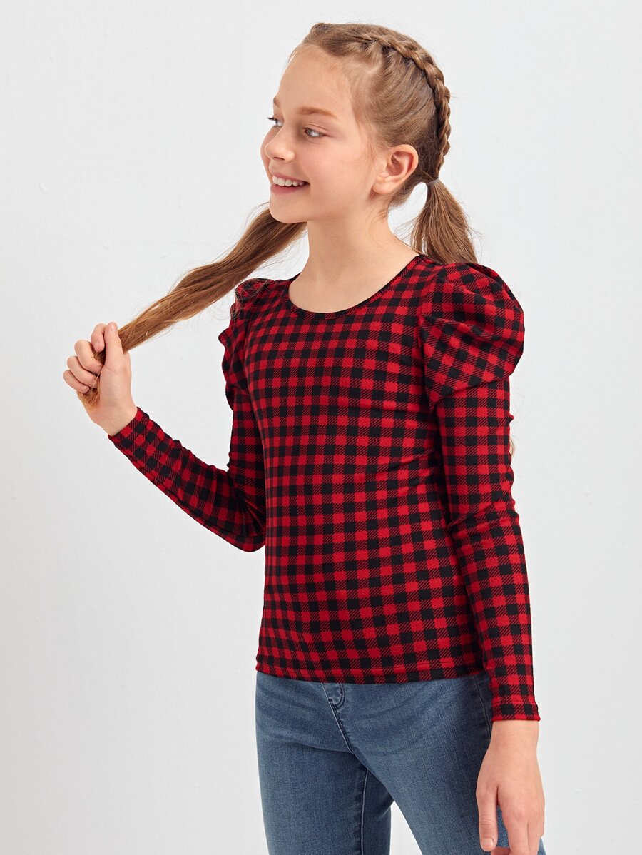 لباس علوي بأكمام ساق الضان وبطباعة مقلم للبنات