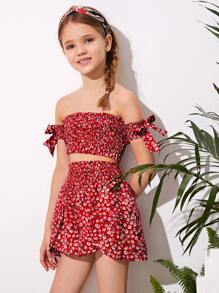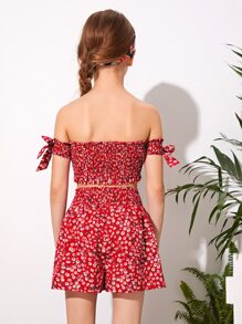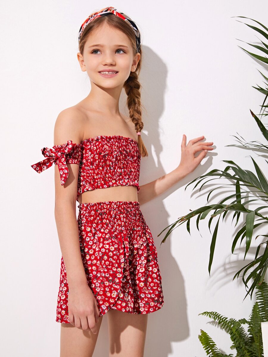 طقم سروال قصير مع لباس علوي مزهر مدرز وباكمام معقود مع اكتاف مكشوفة للبنات
