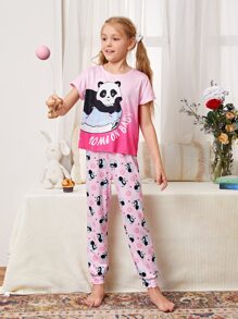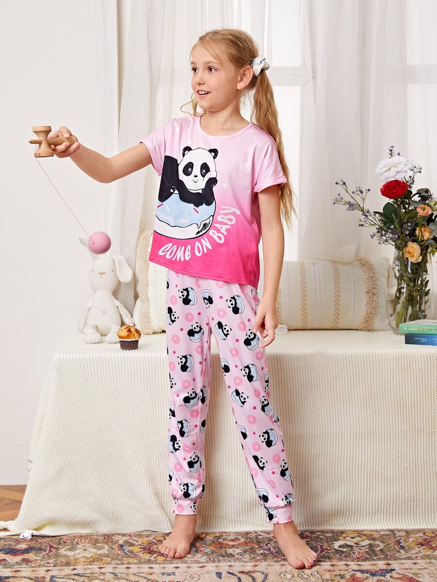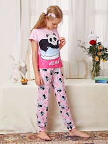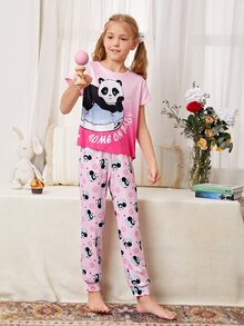 طقم بيجامة بنطلون مع تي شيرت بطباعة الباندا للبنات