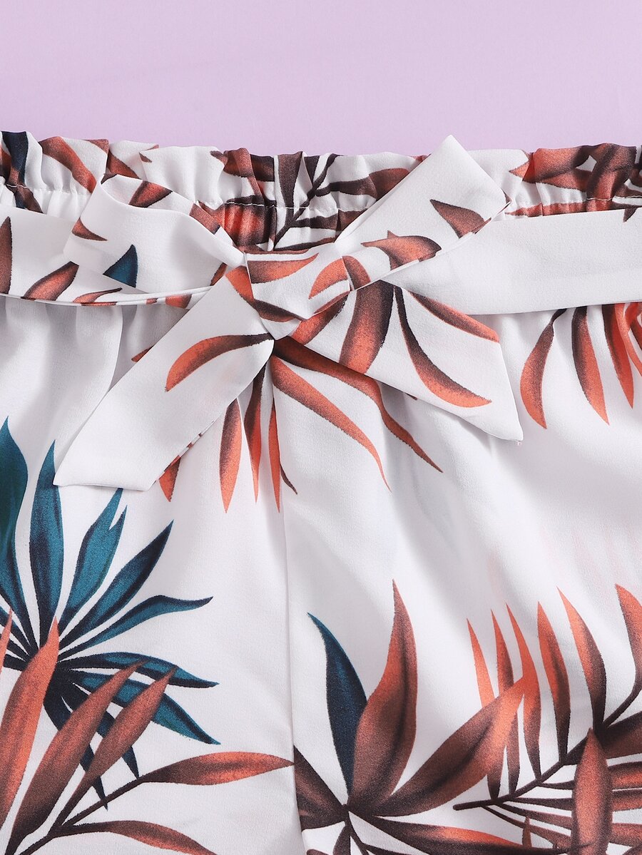طقم شورت استوائي بحزام بخصر مكشكش ورقي مع لباس علوي كامي مقلم صدفي للبنات