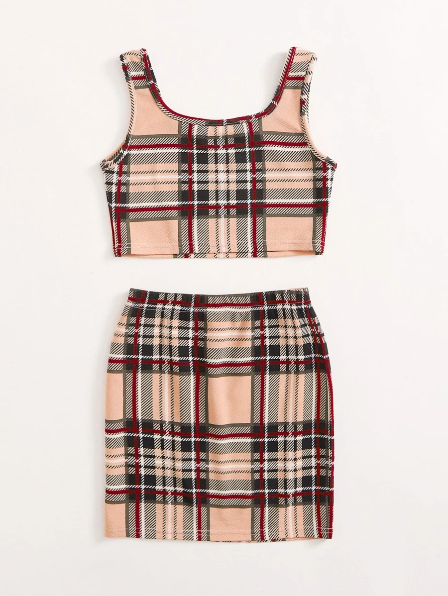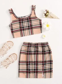 طقم تنورة مع لباس علوي تانك مربع النقش بياقة عميق للبنات