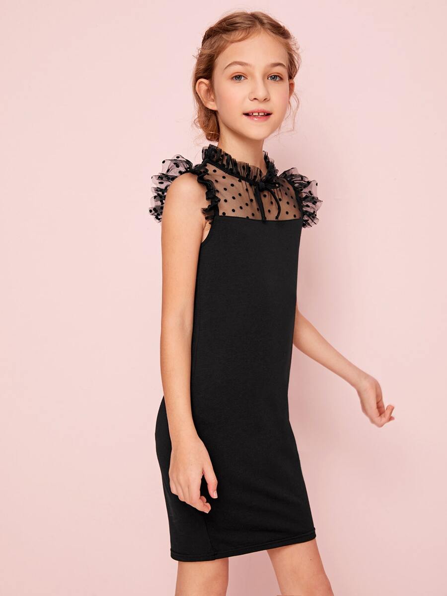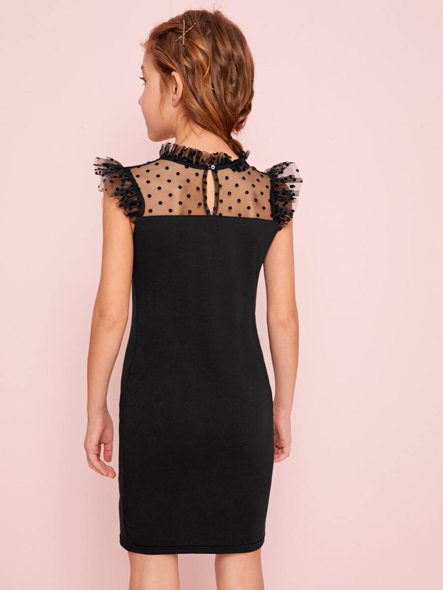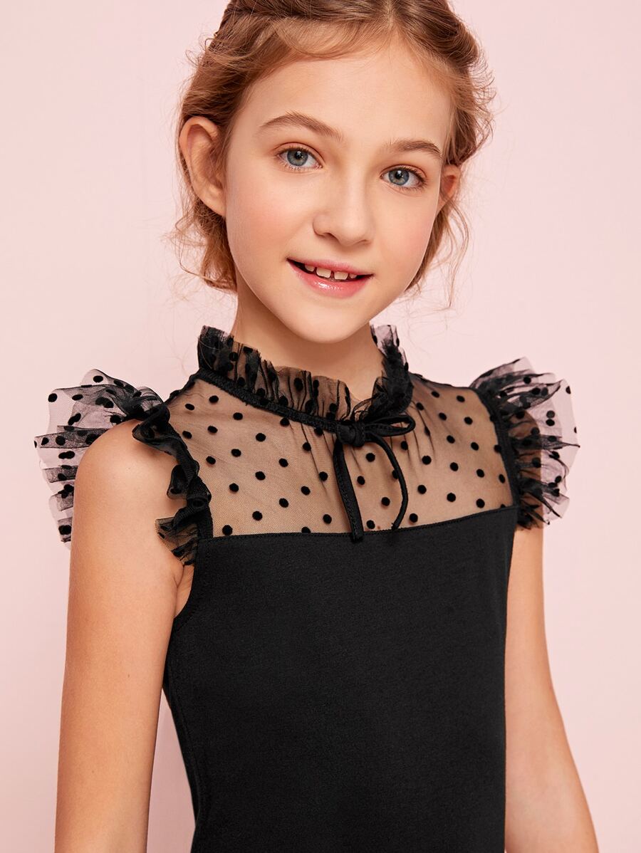 فستان بصدر شبكي وبنقاط البولكا مع عنق هدب وبربطة للبنات