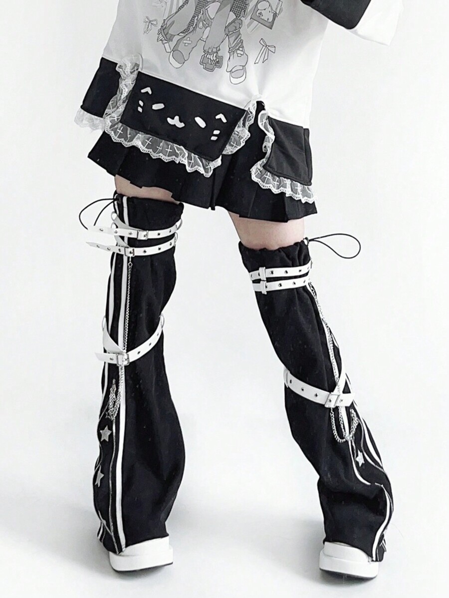 Goth زوج واحد من الكاحلين المحبوكين بطراز البانك مع ستارة على الركبة وسوستة، أنيق وفريد من نوعه، مناسب للارتداء اليومي ولباس الحفلات الاحتفالية، مع زينة سلسلة معدنية