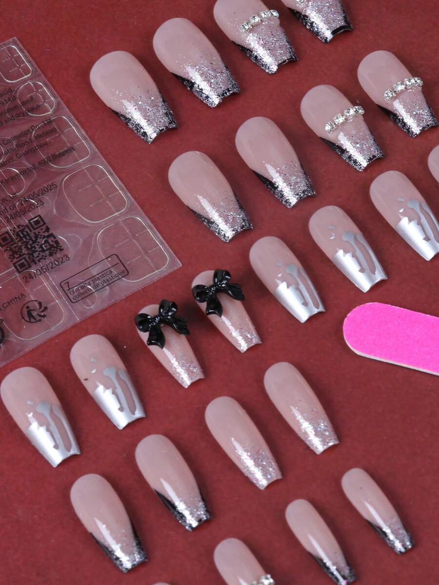 Goth 24 قطعة مزخرف بقوس أظافر اصطناعية مع ورقة واحدة اظافر شريط