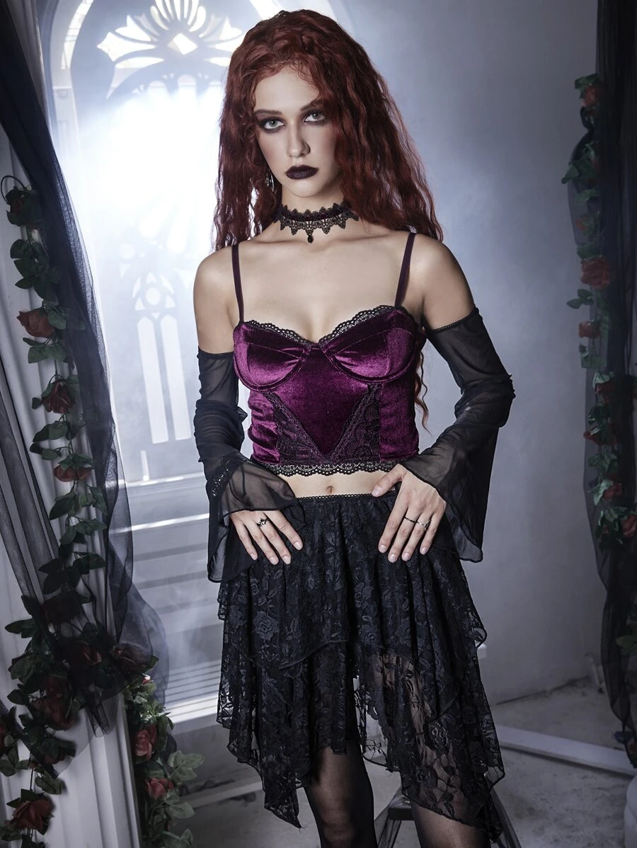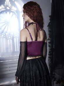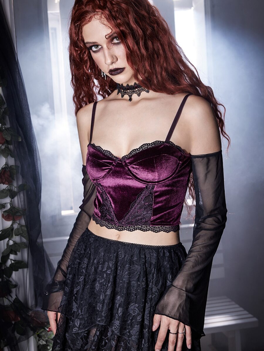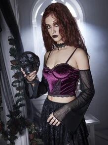 Goth لباس علوي دانتيل متباين اللون كتف مكشوف مخملي