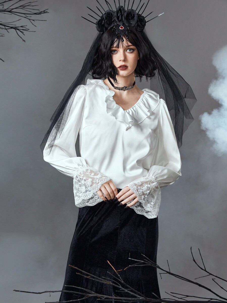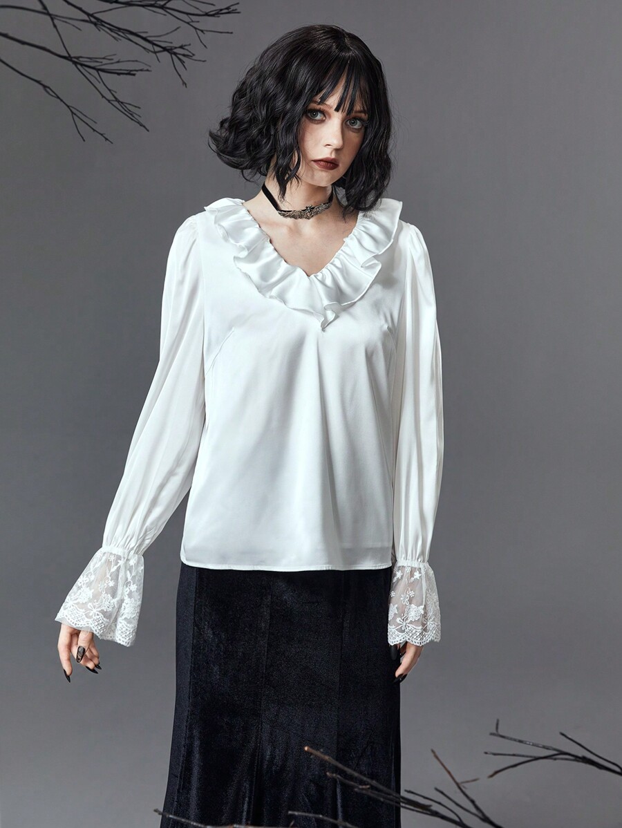 Goth بلوزة مزينة بحواف كشكش من الدانتيل المتباين وأكمام واسعة مطوية