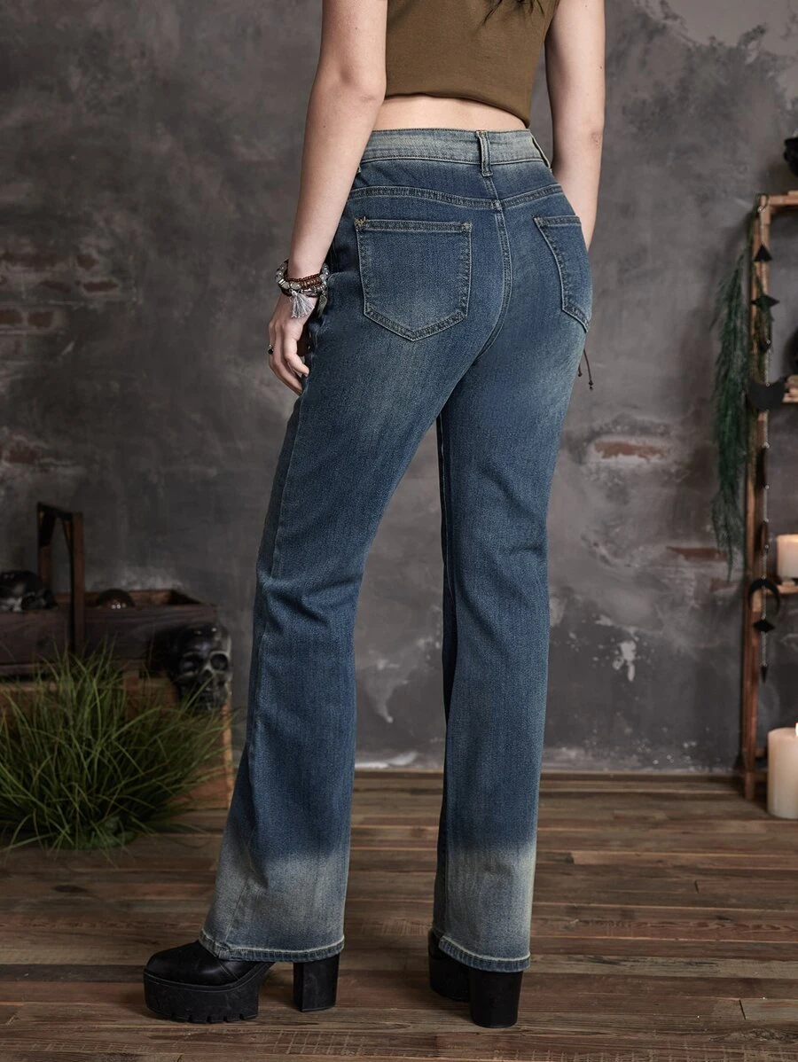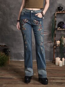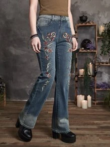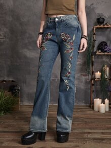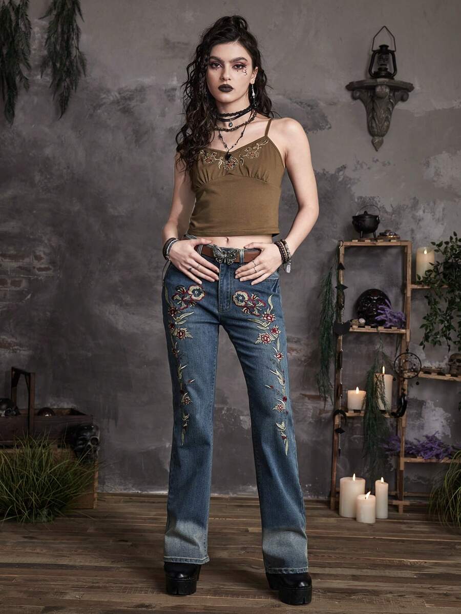 Goth بنطلون جينز واسع من الاسفل مطرز بأزهار