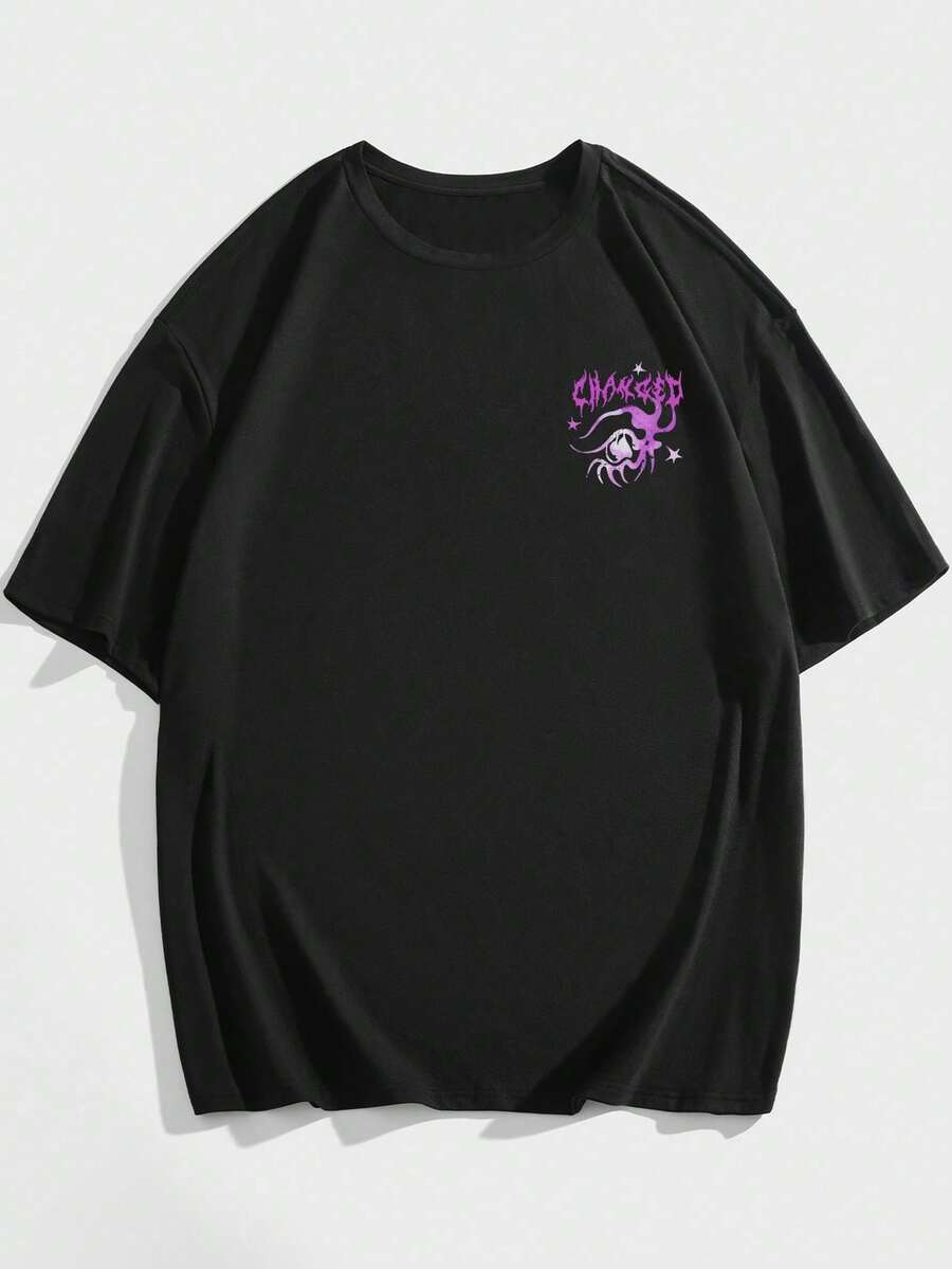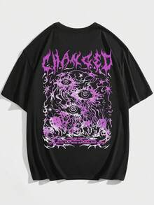 Goth قميص تي شيرت قصير الأكمام كاجوال للرجال مع طباعة شعار وتصميم عين، صيفي