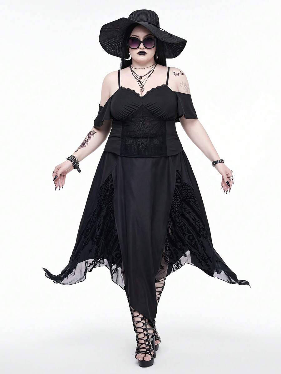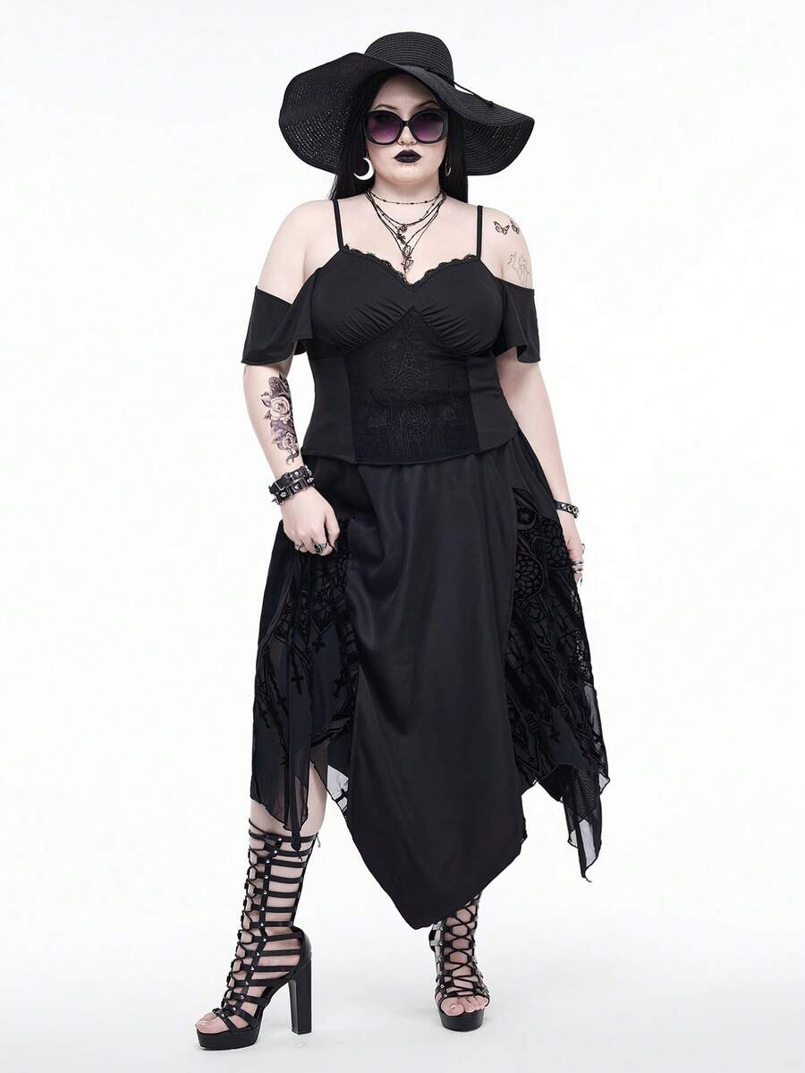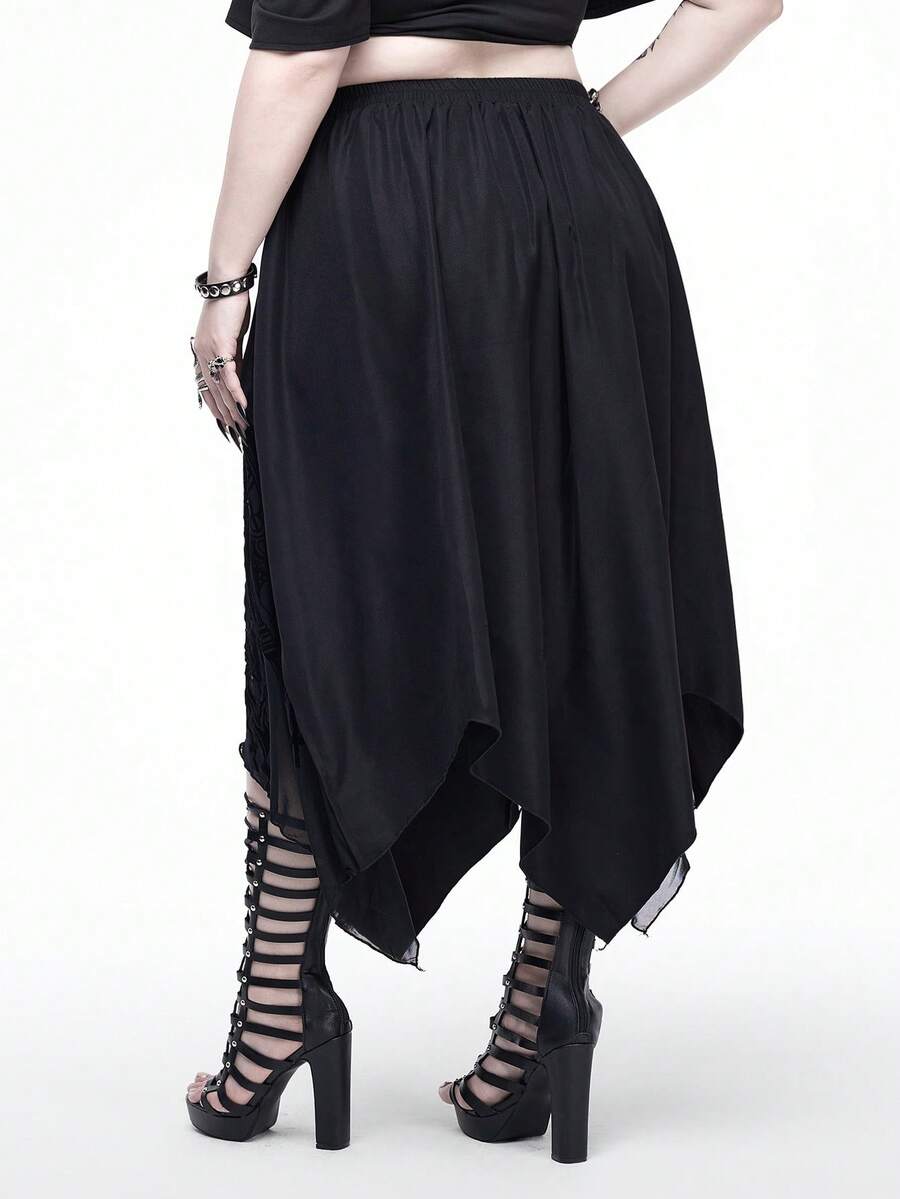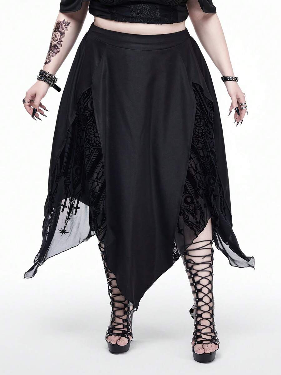 Goth تنورة حريرية مزينة بطراز القصر الجوتي لكبار الحجم مع نمط جاكار وحافة غير متماثلة