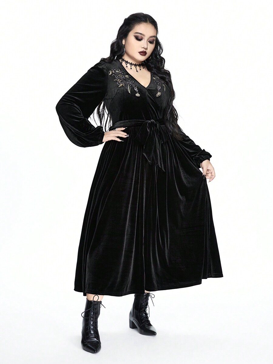 Goth فستان طويل الأكمام مخمل عميق الياقة على شكل أفعى بأنماط مطرزة مثيرة، مقاس كبير، جوتية، لعيد الهالوين