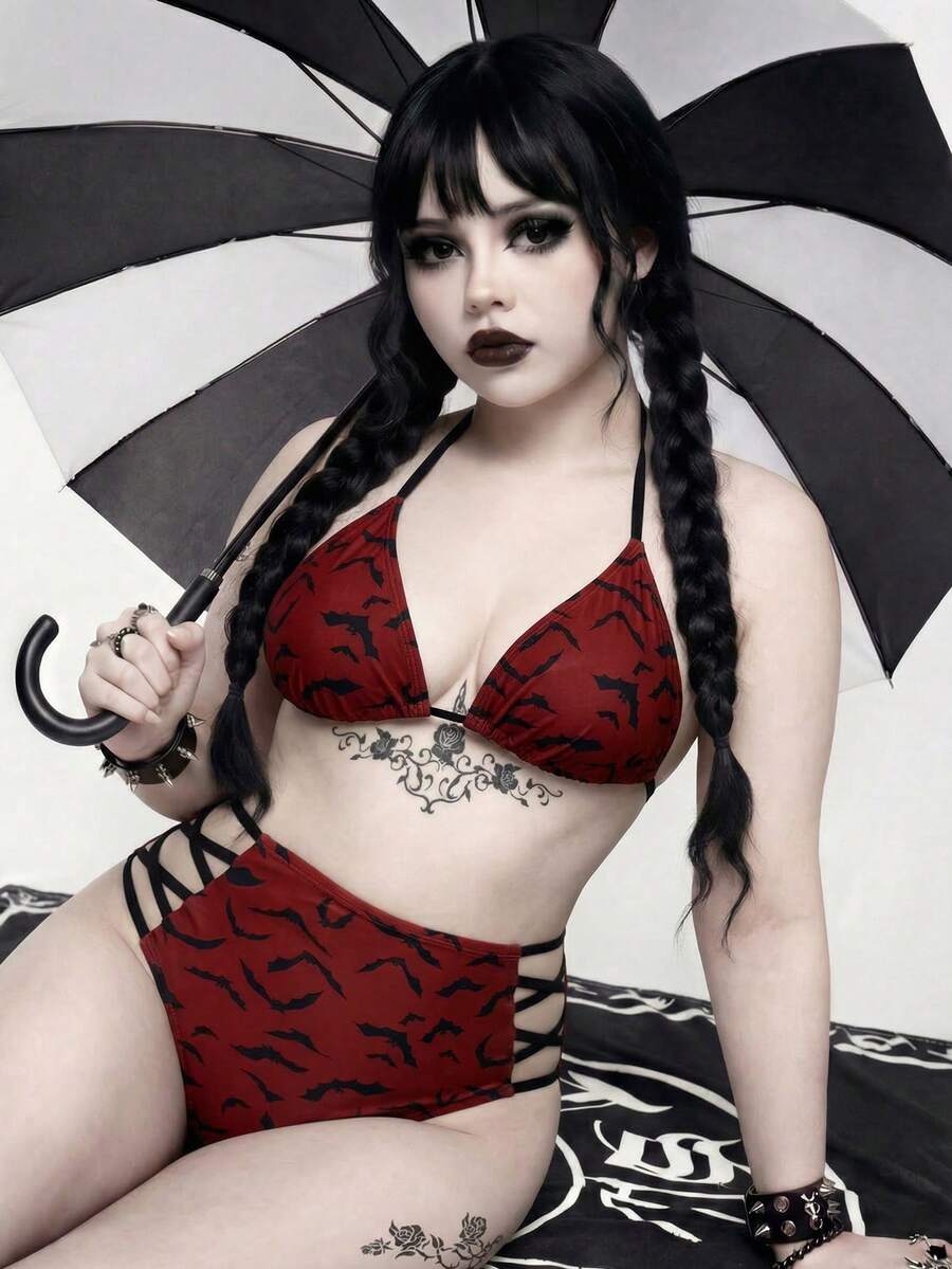 Goth مجموعة بيكيني للنساء ذوات الحجم الكبير مكونة من 2 قطعة، طبعة خفاش عشوائية باللون الأحمر، قطعة علوية بكأس مثلث وقطعة سفلية مرتفعة الخصر بخصر مطاطي، مناسبة للاستخدام اليومي والعطلات
