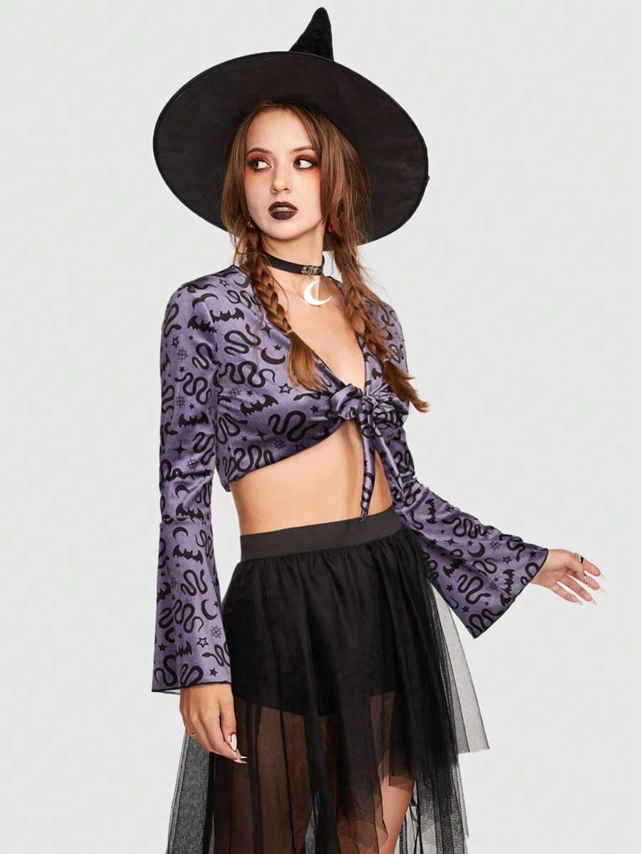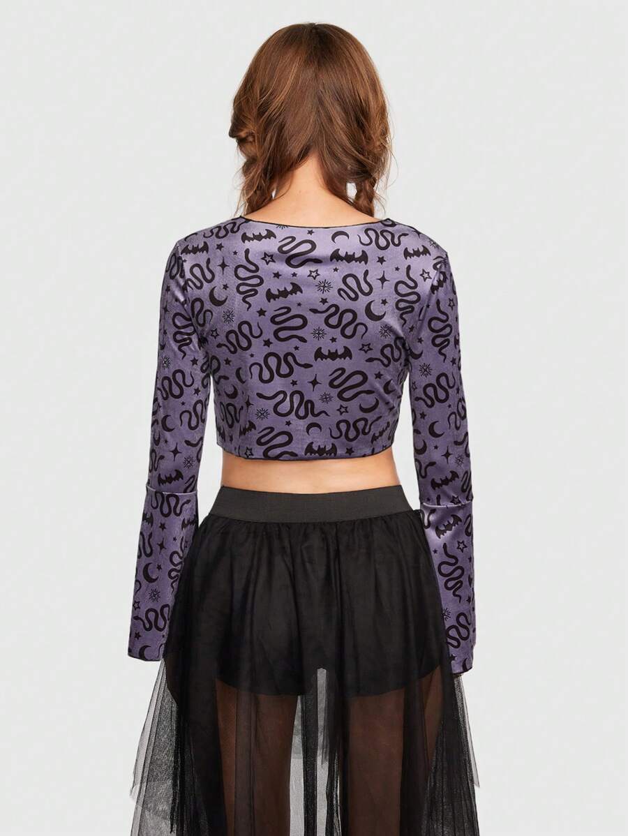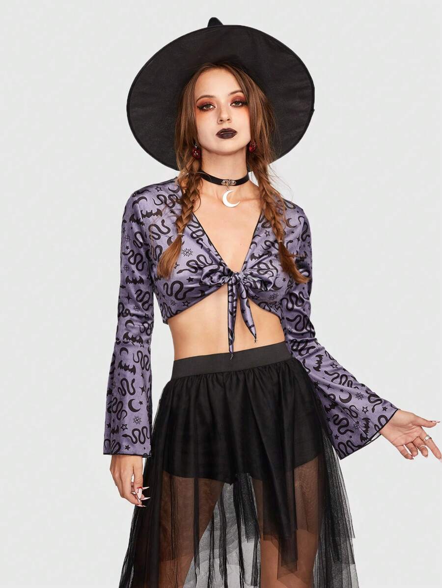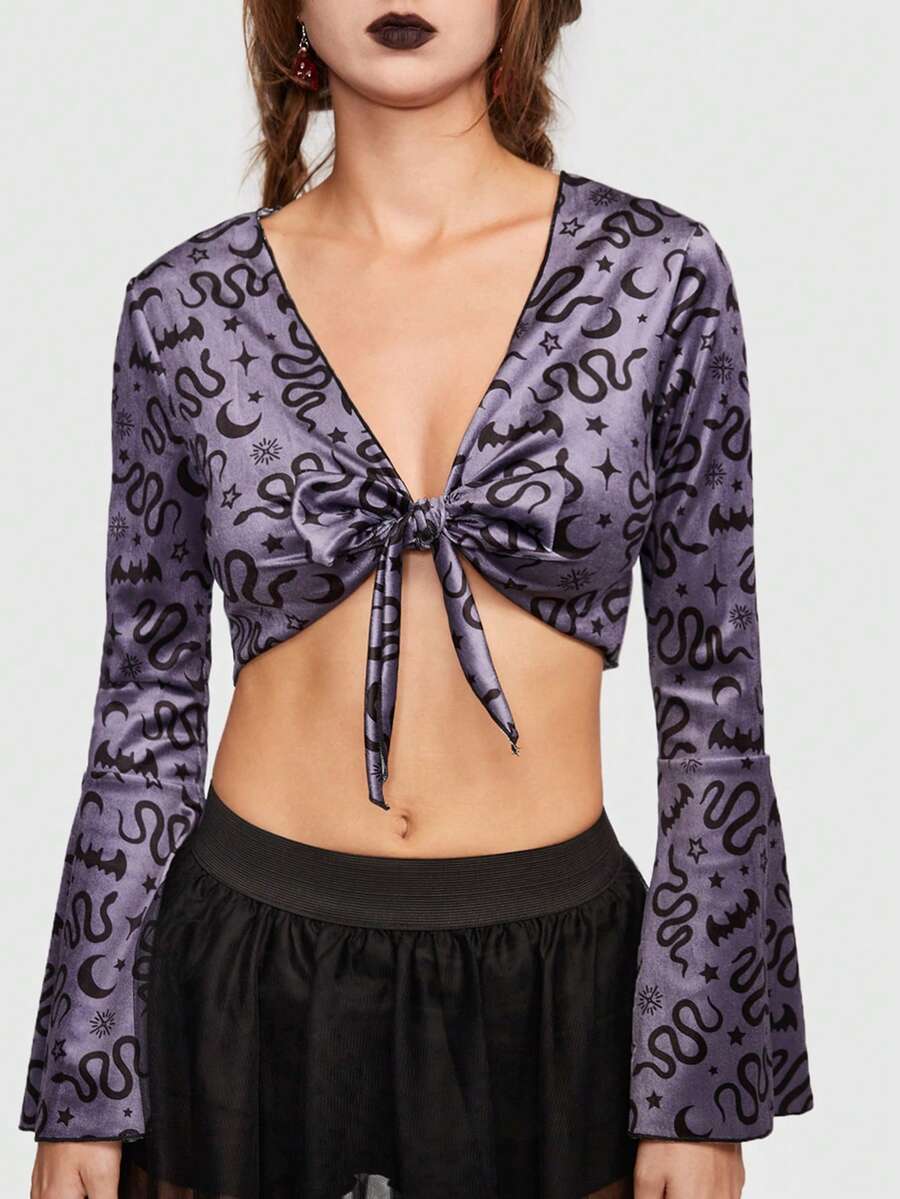 Goth لباس علوي قصير طباعة الأفعى ربطة امامية أكمام جرس