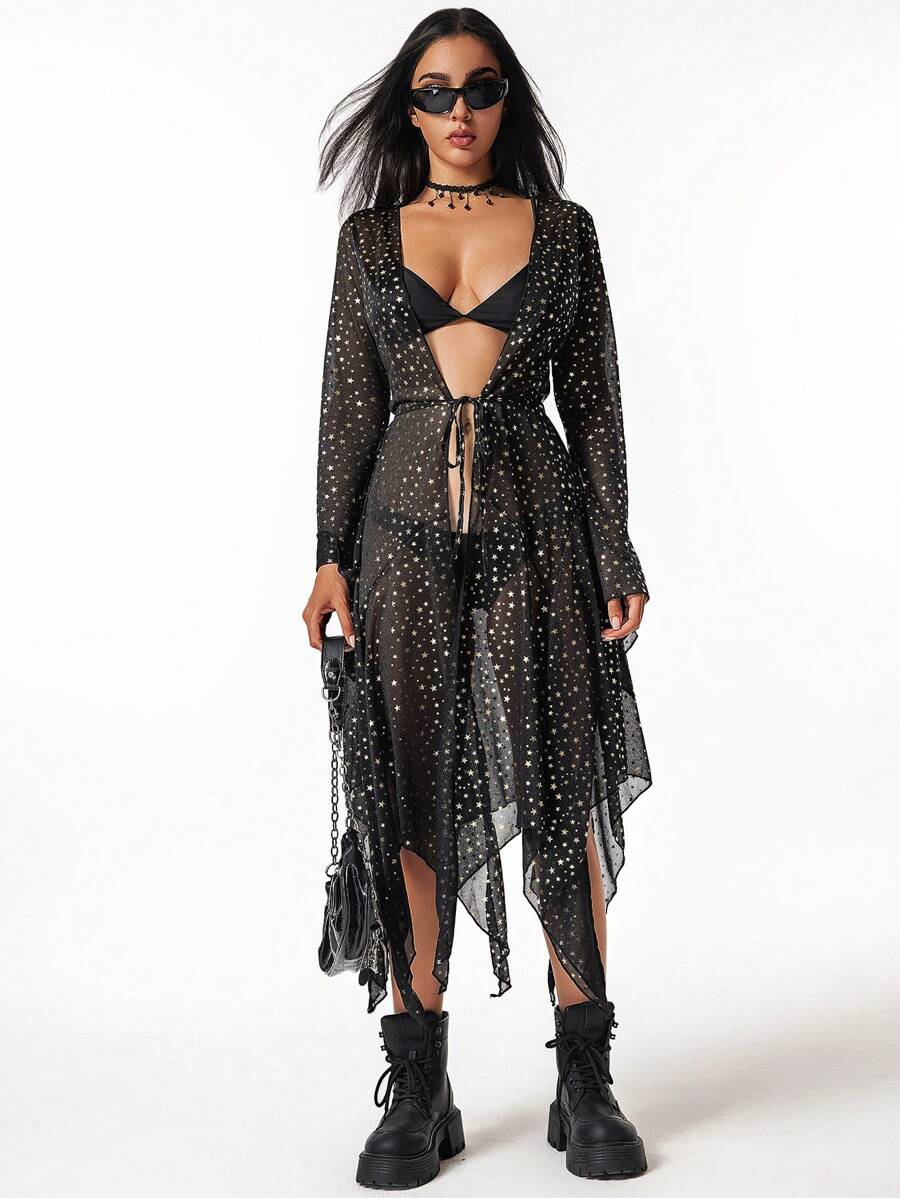 Goth كيمونو طويل مفتوح الأمام بأكمام واسعة وحاشية غير متماثلة مصنوع من قماش نجمي لامع، مناسب للصيف وعيد الهالوين