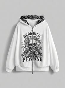 Goth بلوزة هوديي كاجوال بطبعة جمجمة وزهور وفهد، بسحاب للنساء، طراز الشارع والهالوين والبنك روك