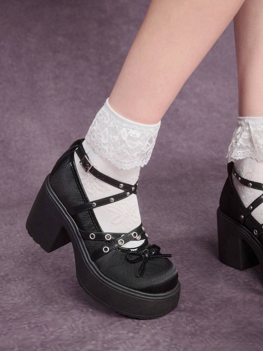 Goth حذاء ماري جين للنساء باللون الأسود، مغلق الأصبع، مزين بشريطة وفيونكة، كعب سميك شكل مكعب، أحذية عمل رسمية، أكسفورد بطراز هجين بين بانك/روك/فتاة مدرسية
