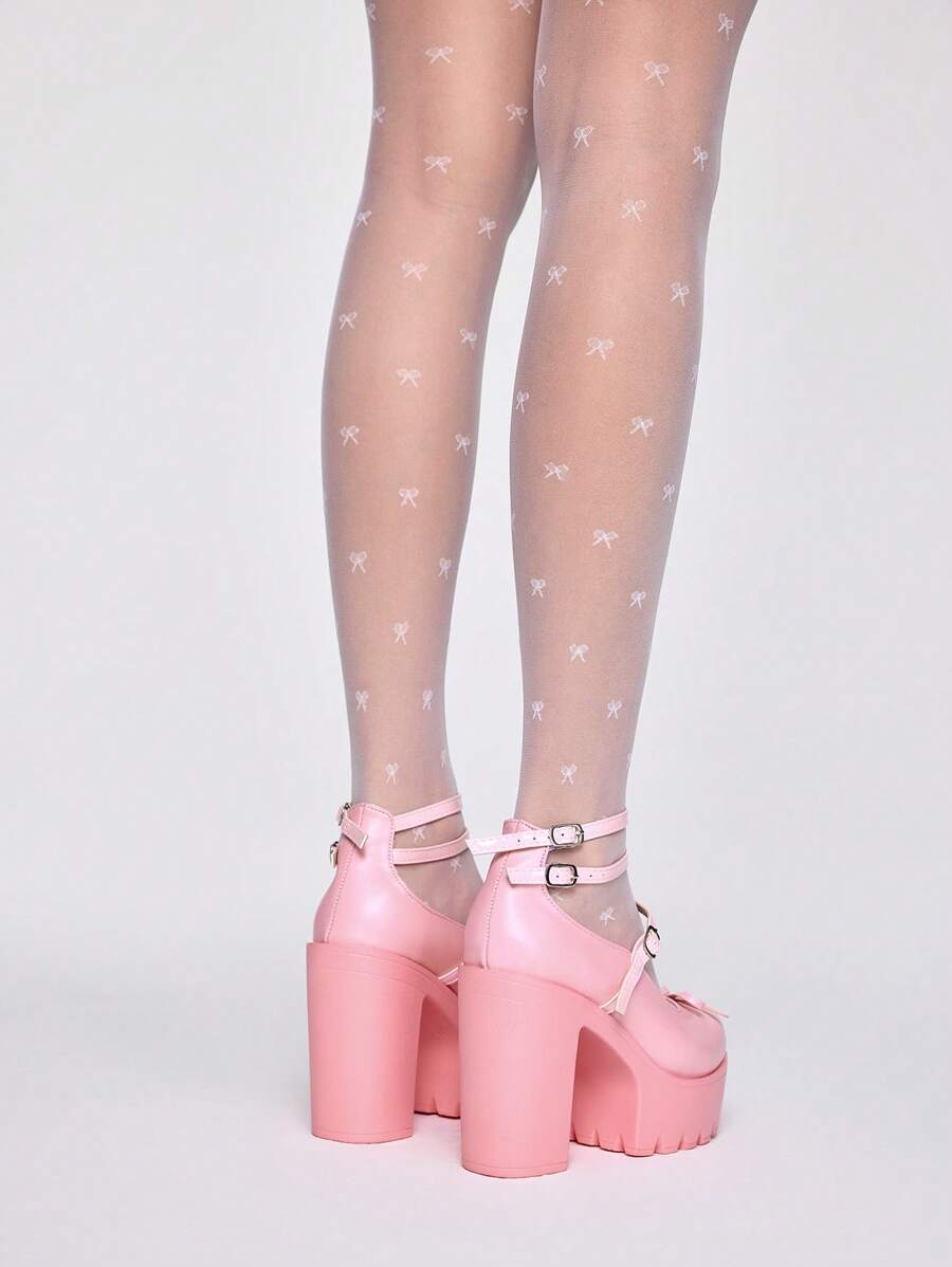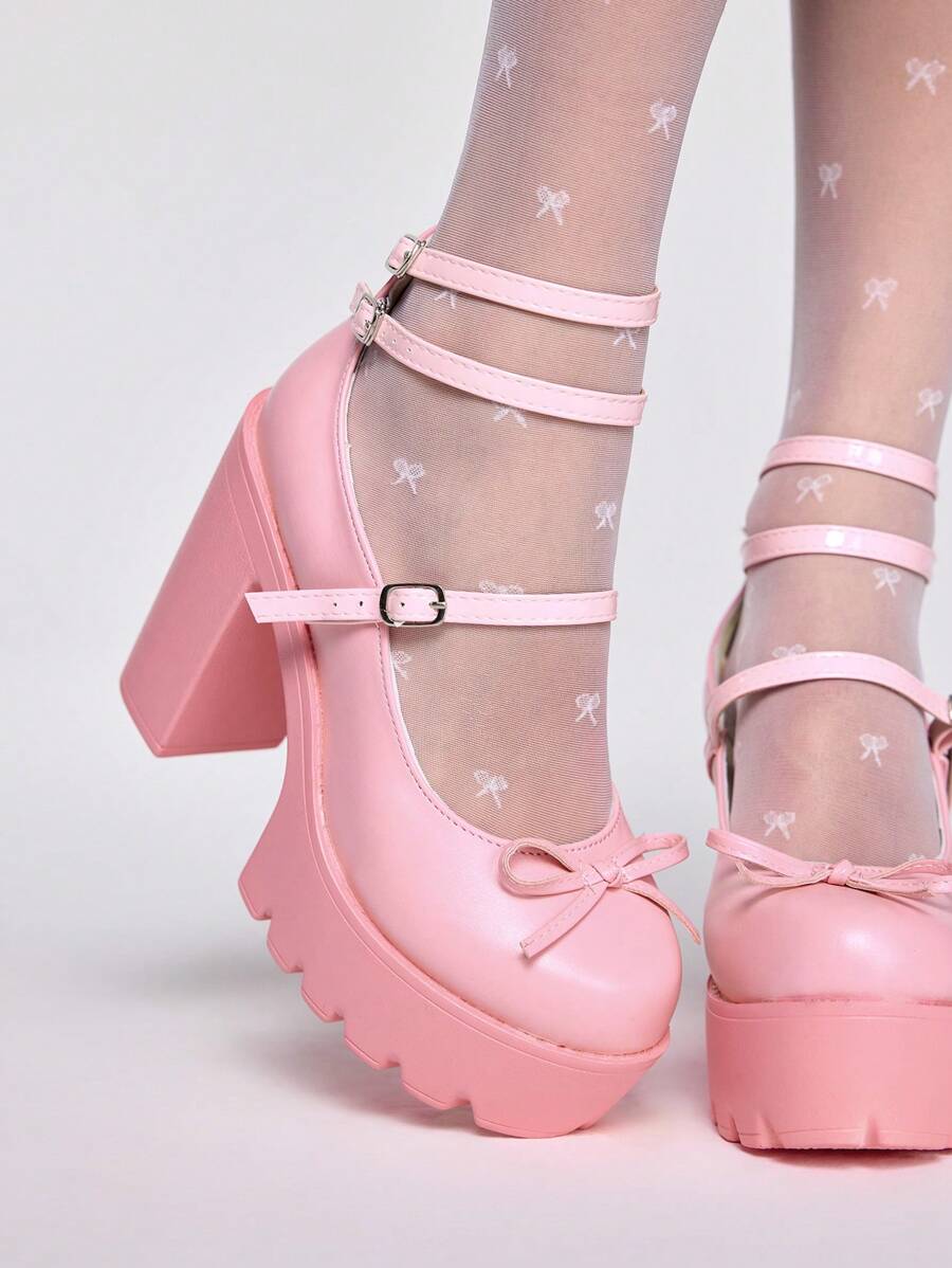 Goth أحذية بكعب عالٍ على شكل ماري جين للنساء، لون وردي، إغلاق أصابع مغلق، حزام على شكل فراشة، حذاء كعب متألقة