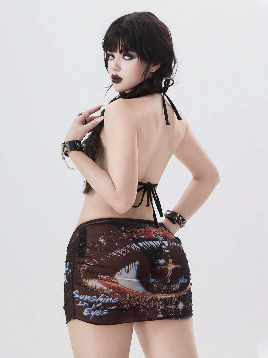 Goth مجموعة بيكيني نسائية صيفية مكونة من حمالة رقبة مزينة بالدبابيس وتنورة قصيرة مع غطاء مطبوع بالفتحات