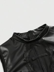 Goth سترة نسائية ضيقة بدون أكمام من الجلد الصناعي (البولي يوريثان) مع تصميم شبكي مزخرف بالصليب الجوتي