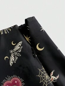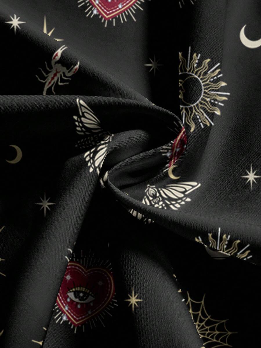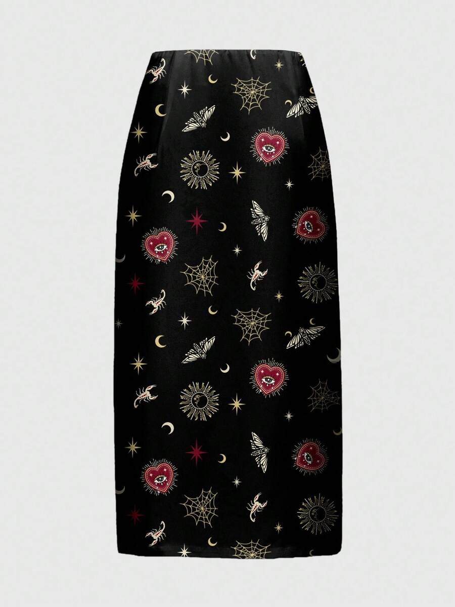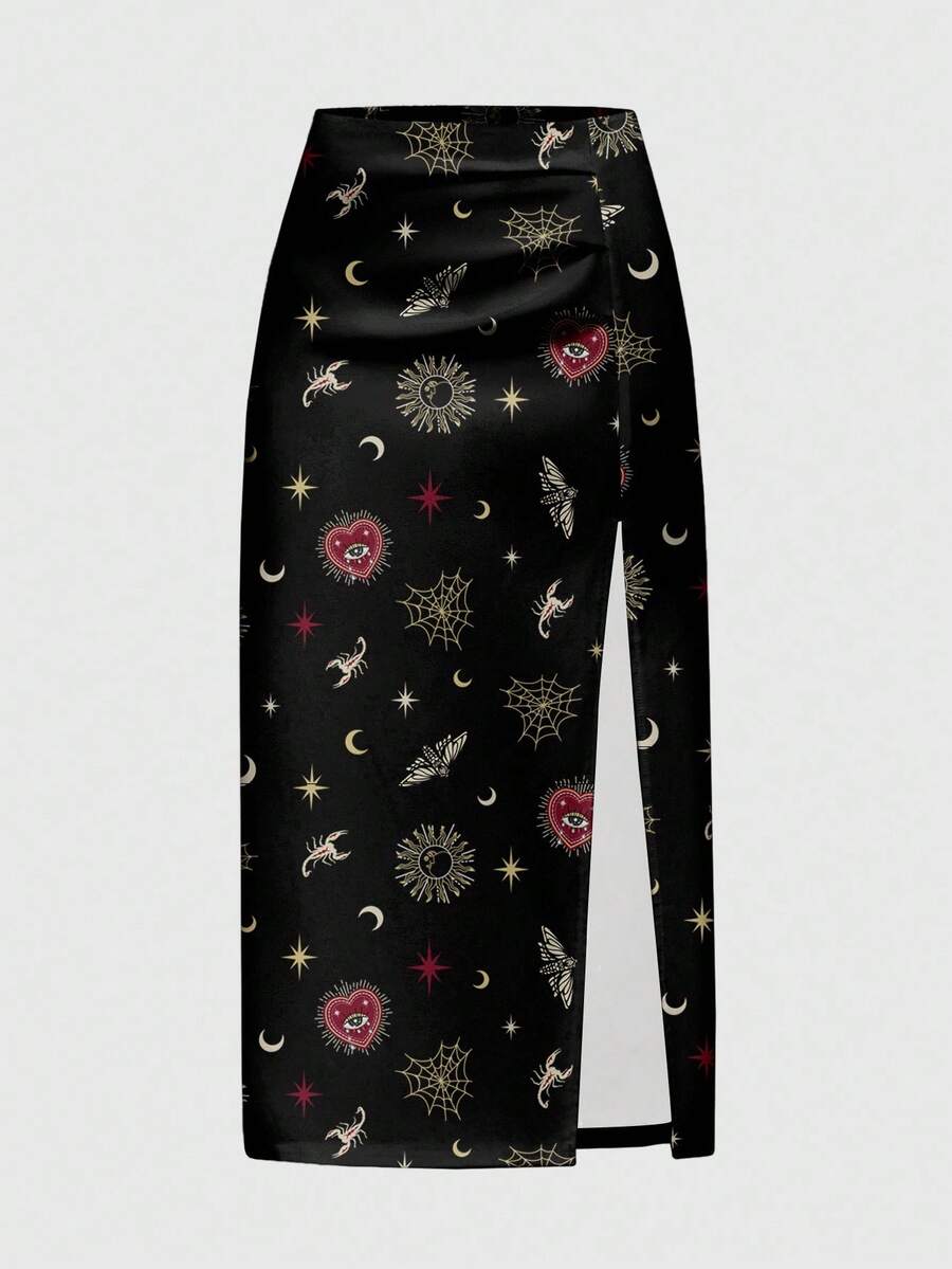 Goth تنورة سوداء طويلة مزخرفة بطبعات قلب وشمس وقمر سماوية للنساء، بشق عالي الجانب، بطابع قصر أسود غوثي
