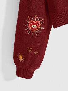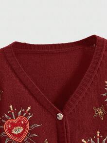 Goth كارديجان كنزة صوفية مطرزة بتصميم شمس وقمر ونجوم وقلوب وعيون بألوان متباينة بطراز ساحر وغامض كالساحرة