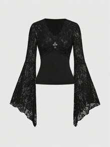 Goth ملابس علوية طبقات الدانتيل الجذاب بياقة على شكل حرف V وأكمام واسعة، مناسب لمناسبة عيد الحب