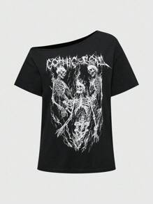Goth تي شيرت نسائي قصير الأكمام بطبعة جمجمة غوثية غير متماثلة الكتف، للهالوين