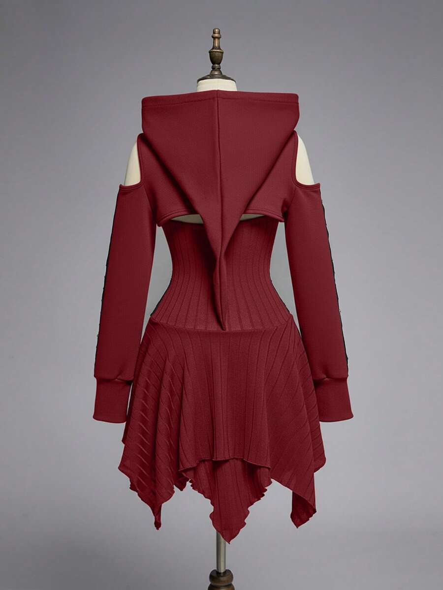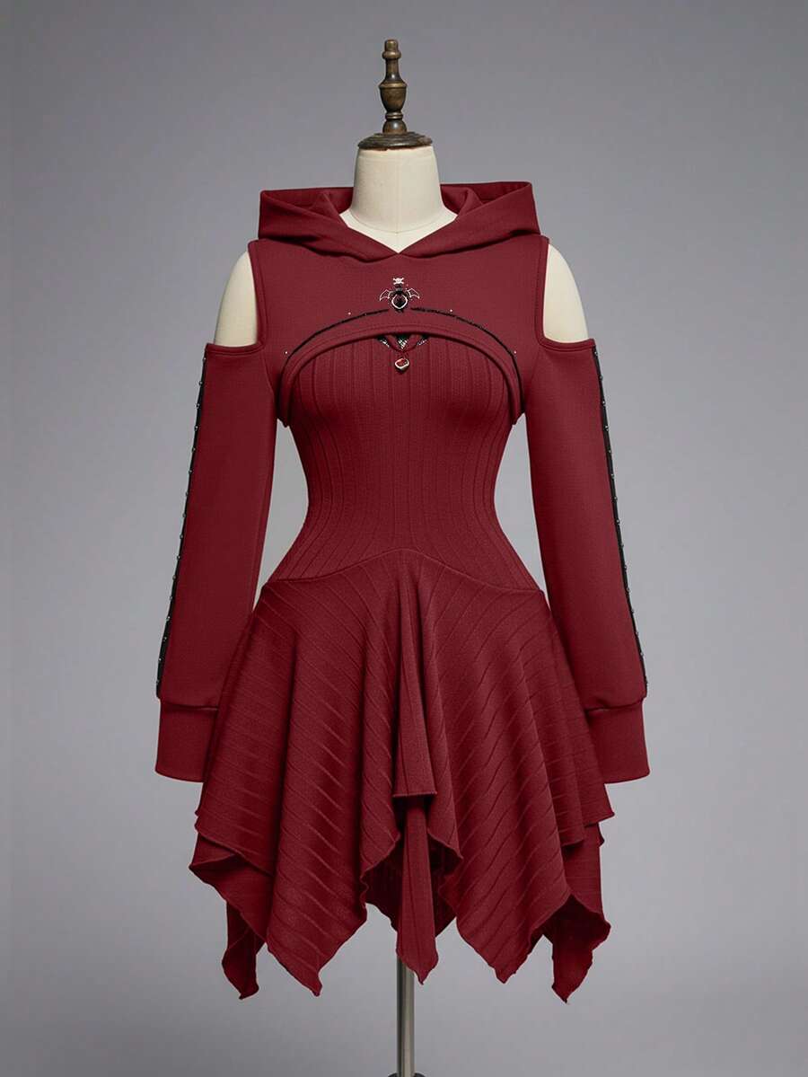 Goth طقم زي ساحرة غوثية - قبعة ساحرة سوداء، وبلوزة كابوشون، وفستان كتف مكشوف