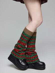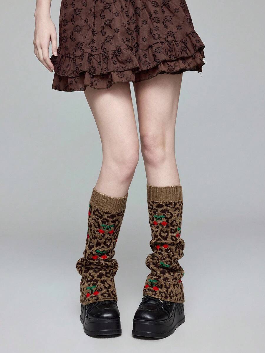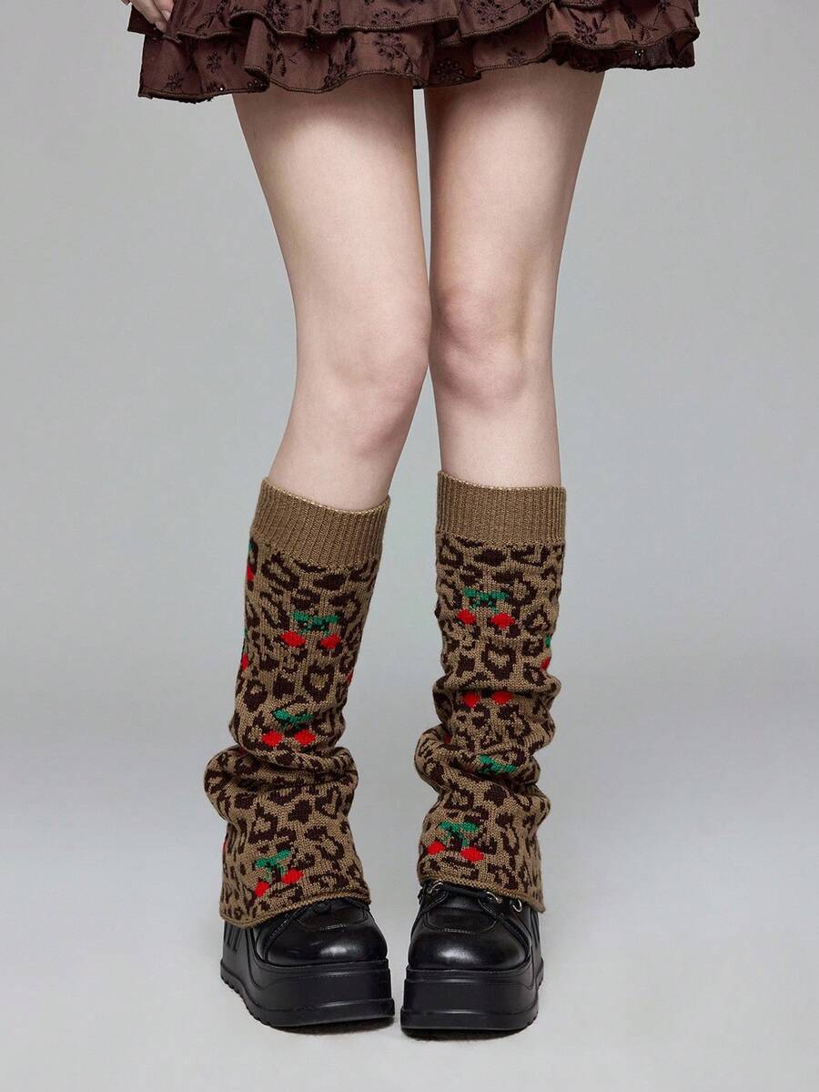 Grunge Punk زوج من دافئات الساق ذات التصميم الكاواييي الوردي والأسود بطبعة قلب نمر وكرز على القاعدة ذات الساق الواسعة