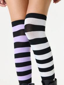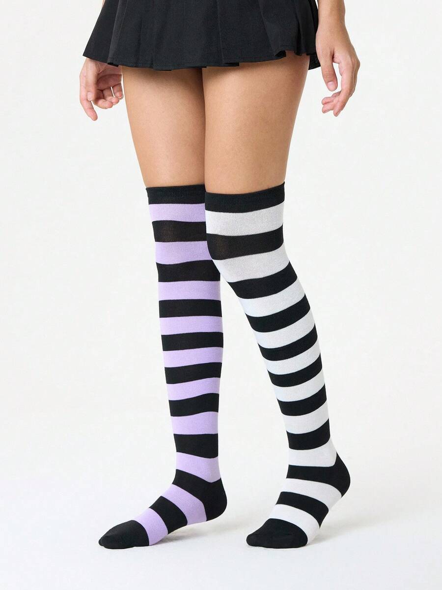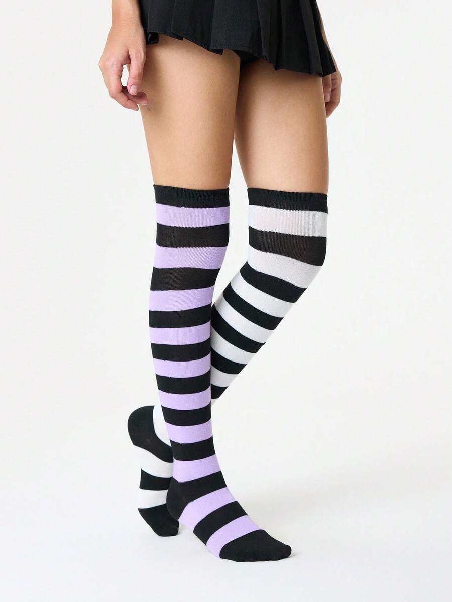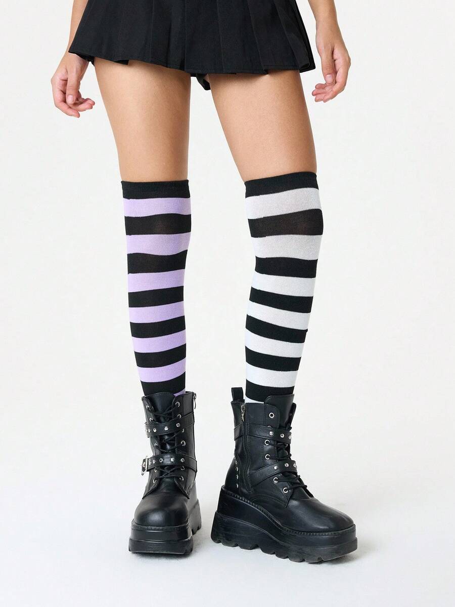 Grunge Punk زوج من جوارب فوق الركبة بنمط بط المندرين الأنيق والبسيط، بتصميم خطوط بنفسجي أبيض وأسود على طراز الكلية Y2K، جوارب شفافة رفيعة مرنة للغاية