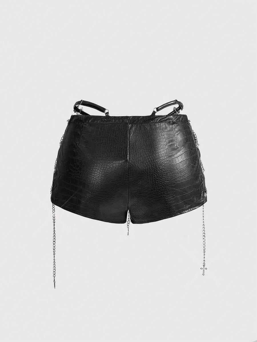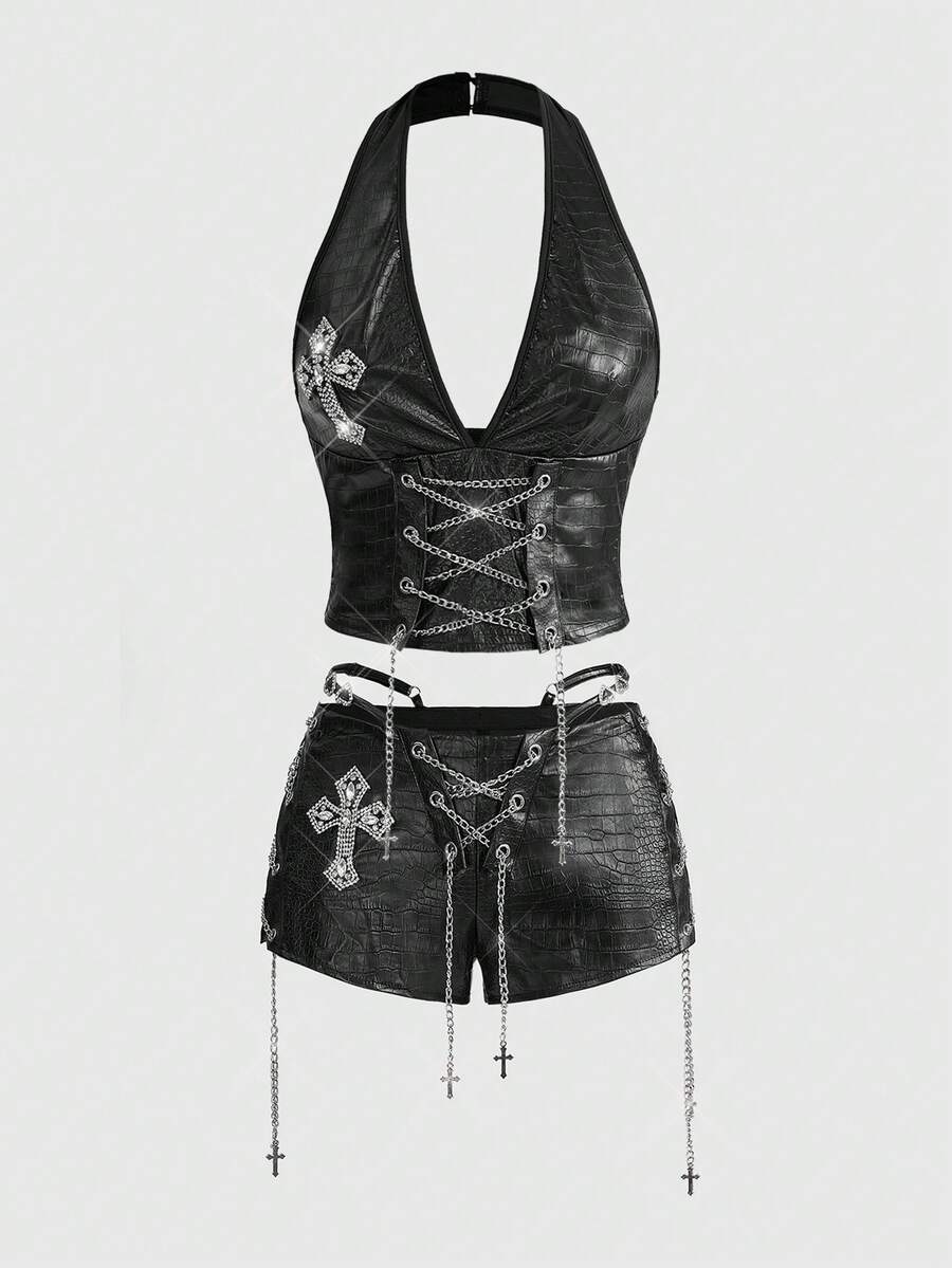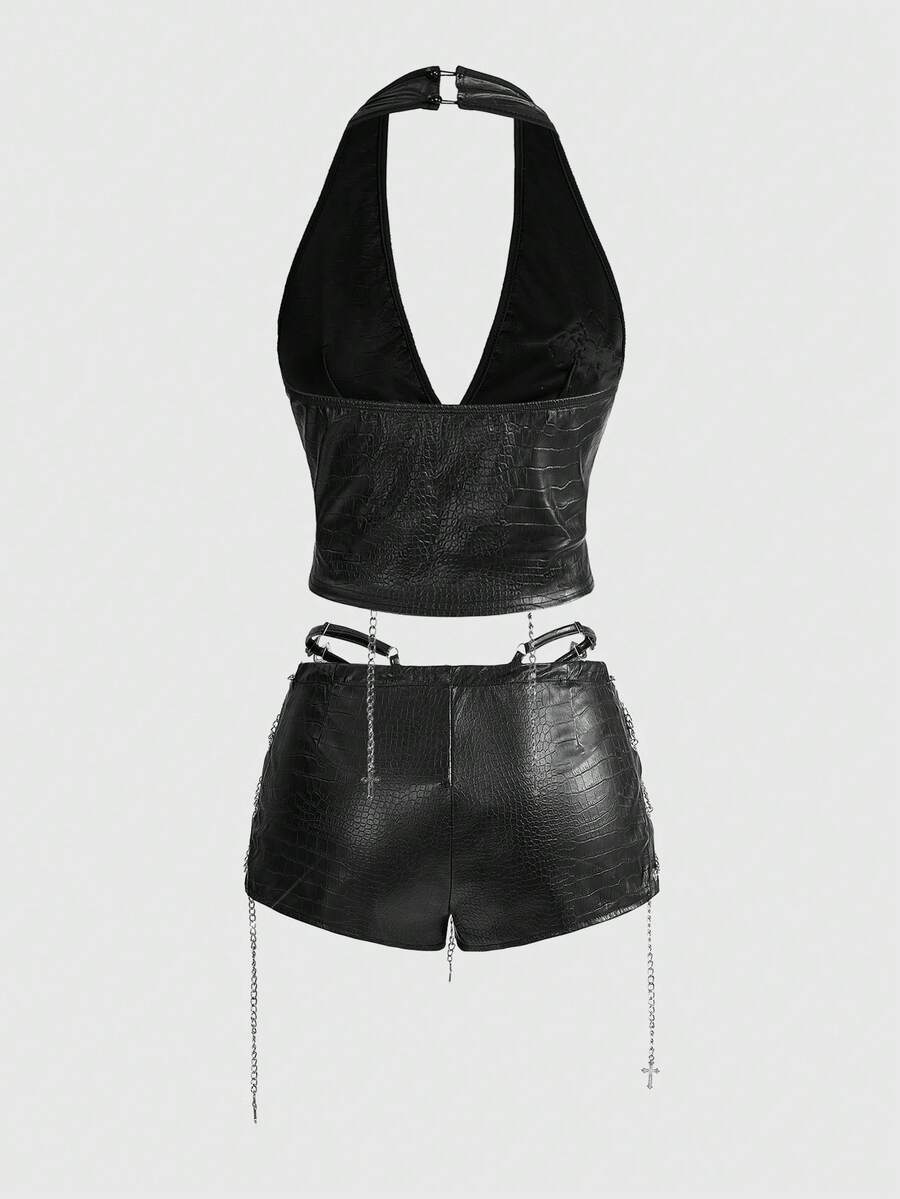 Grunge Punk مجموعة من قطعتين للنساء تتكون من: ملابس علوية قصير بحزام عنق عتيق وشورت ضيق قصير جدًا منخفض الخصر من البولي يوريثان بطراز الدراجات النارية