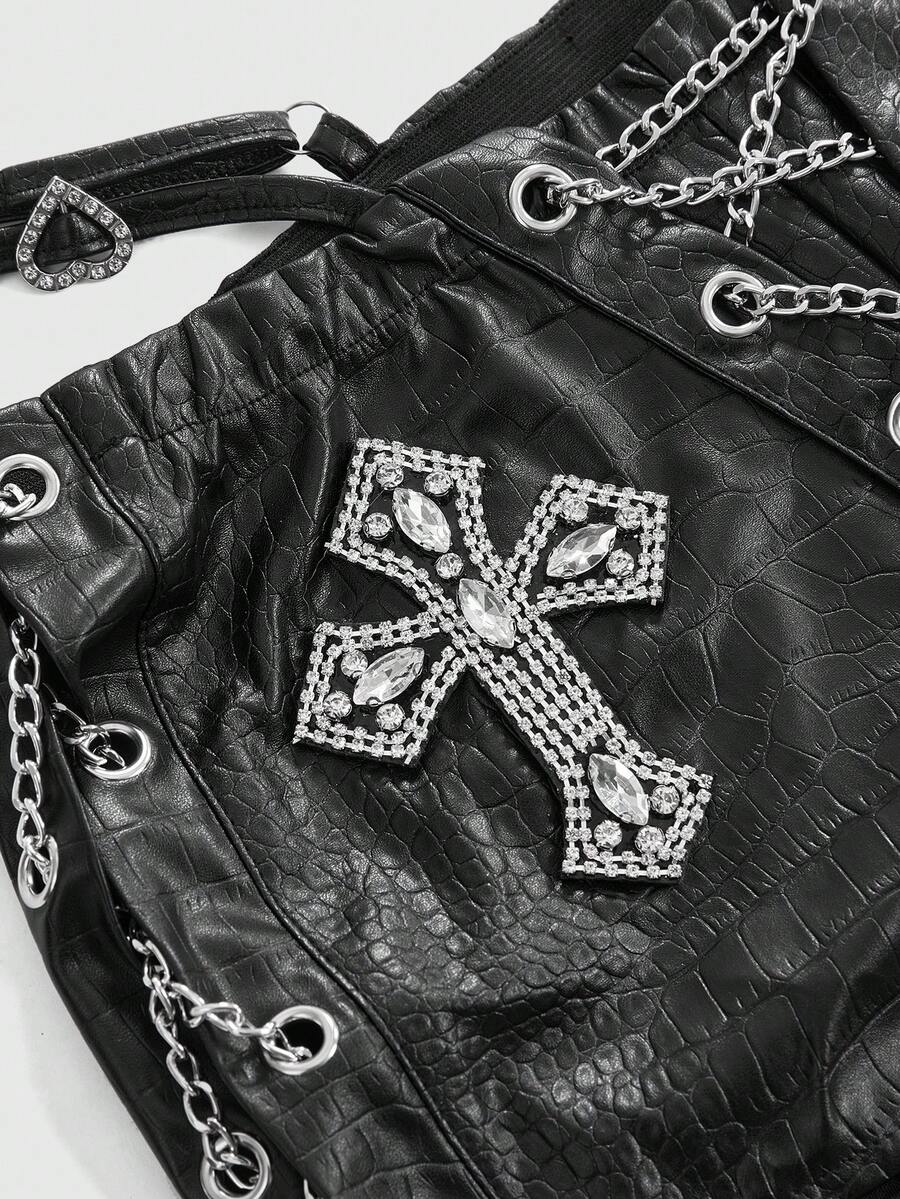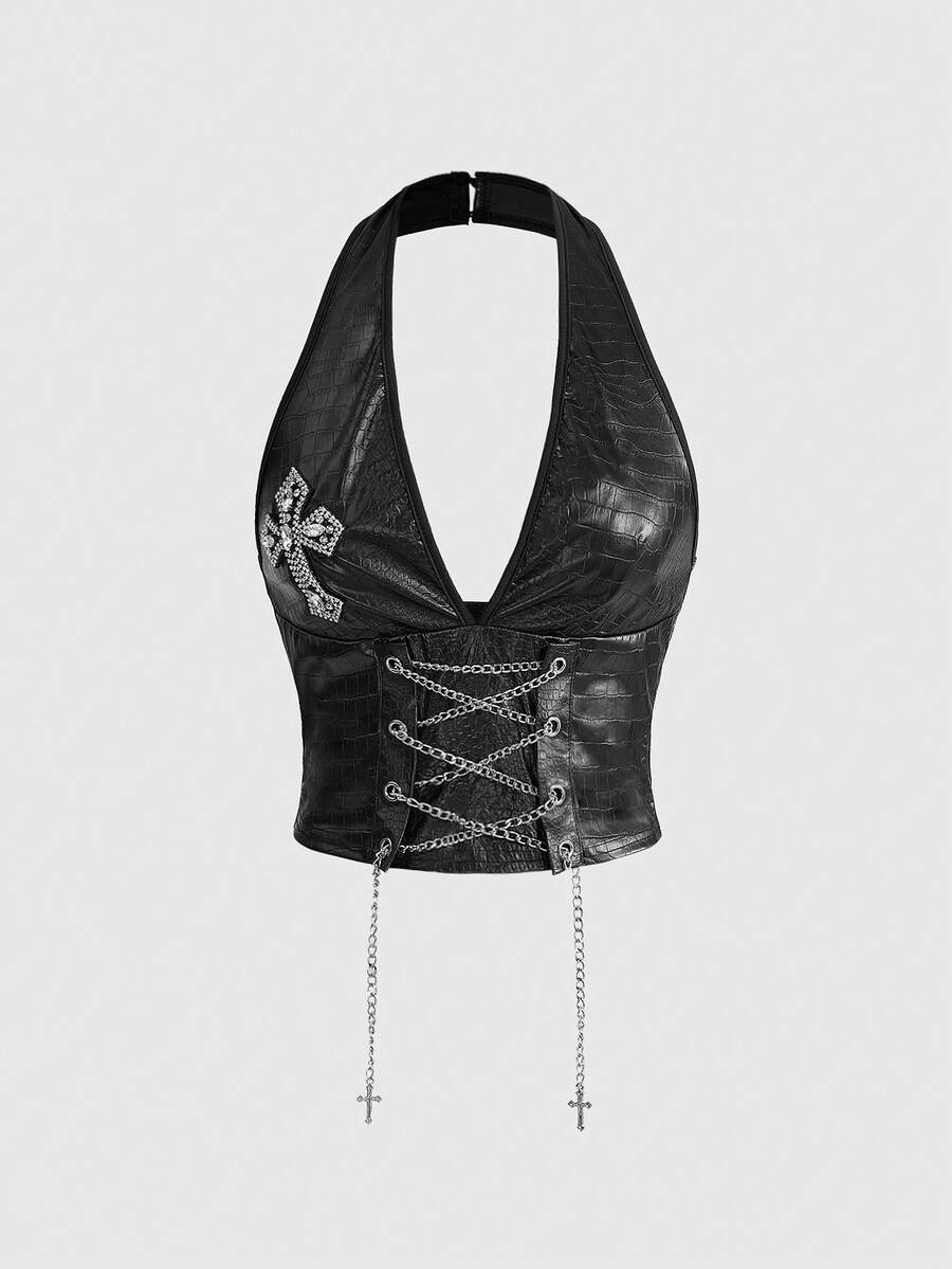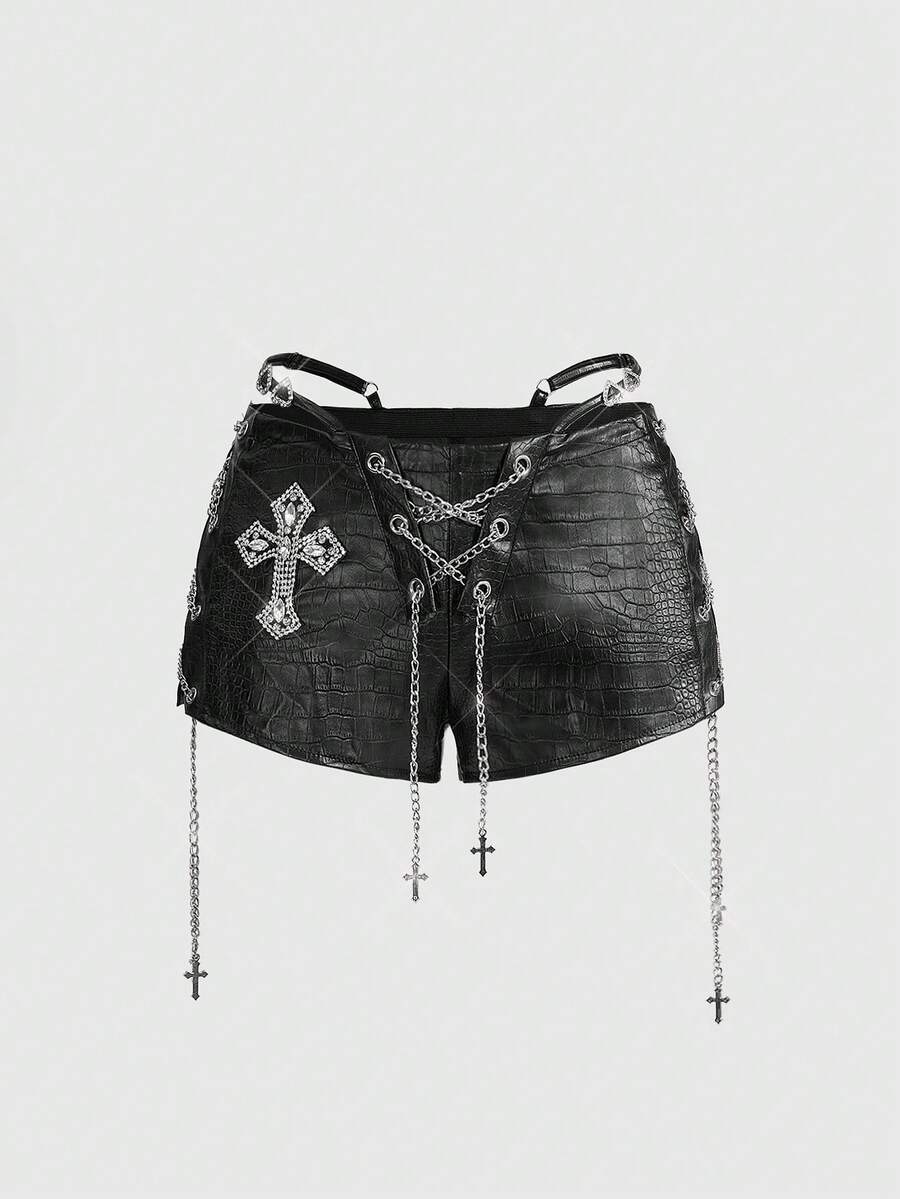 Grunge Punk مجموعة من قطعتين للنساء تتكون من: ملابس علوية قصير بحزام عنق عتيق وشورت ضيق قصير جدًا منخفض الخصر من البولي يوريثان بطراز الدراجات النارية