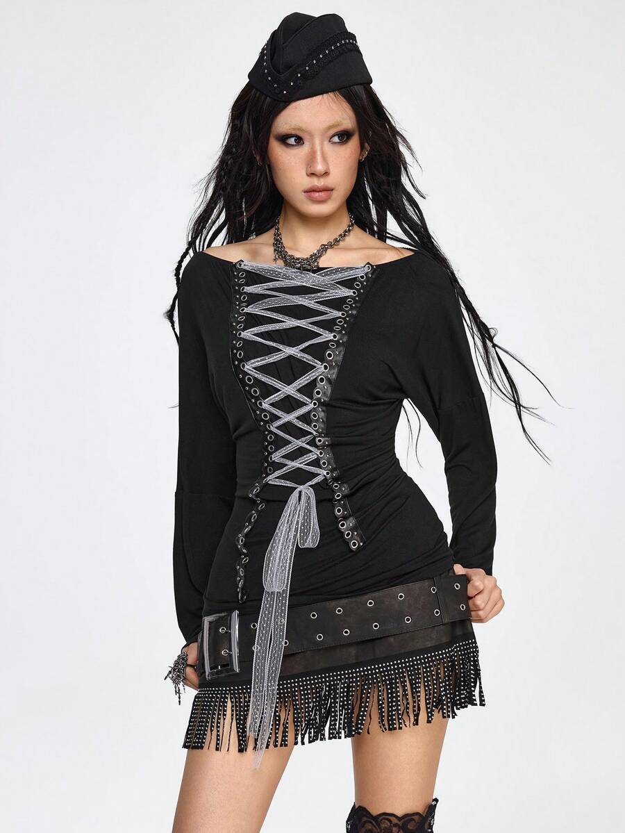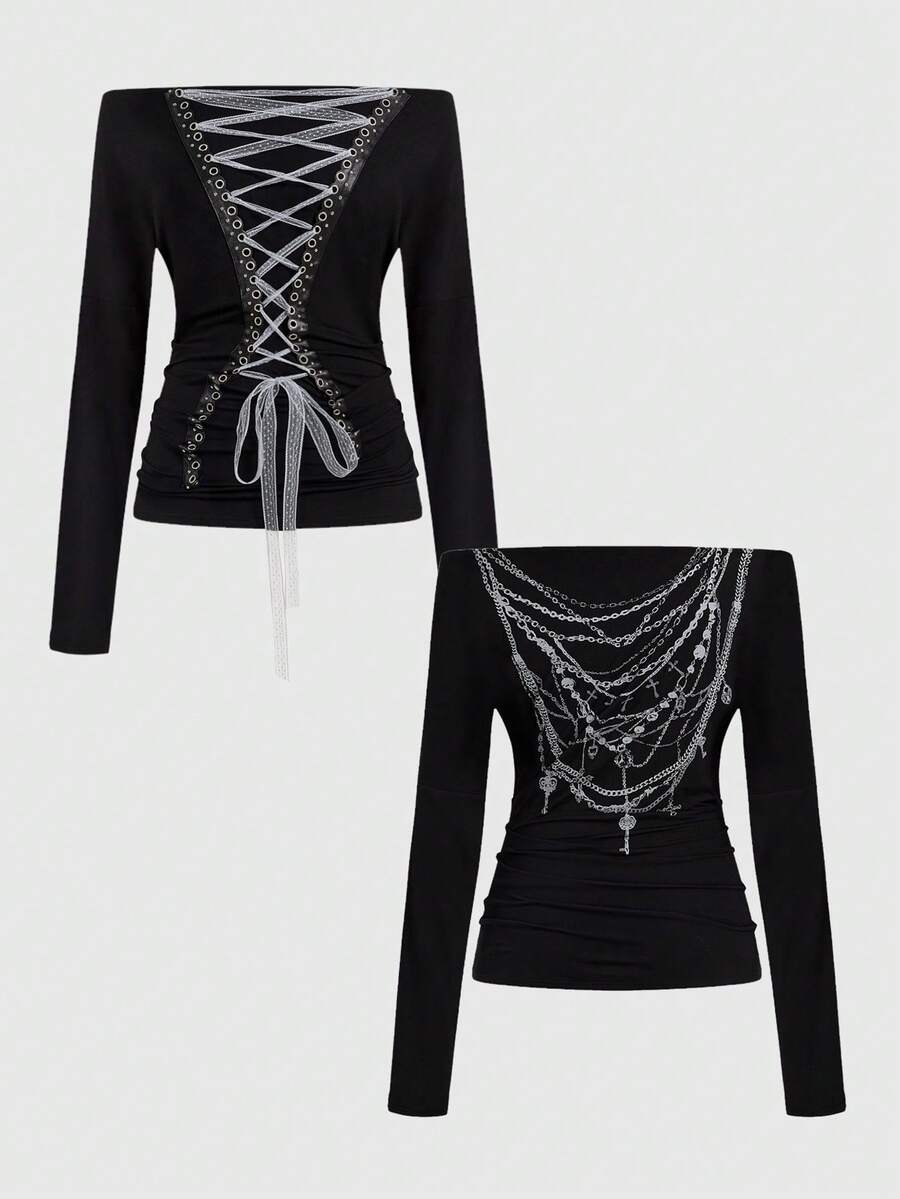 Grunge Punk تي شيرت كم طويل بياقة منحرفة الكتف مع ربطة عنق، طبعة بانك داكنة، قطعة علوية قابلة للتنسيق