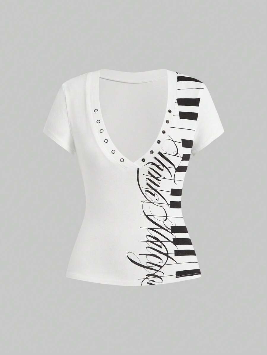 Grunge Punk تي شيرت قطن نقي ضيق مع طباعة حرف إنجليزي وفتحة معدنية على شكل حرف V عميق
