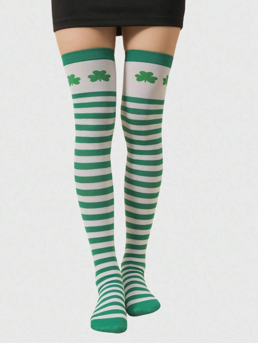 Grunge Punk جوارب طويلة حتى الفخذ بنمط طباعة عشوائي على شكل أربع أوراق شبيهة بالبرسيم الأخضر، جوارب طويلة متعددة الاستخدامات على طراز Y2K مناسبة للحفلات والتجمعات والمناسبات الاجتماعية