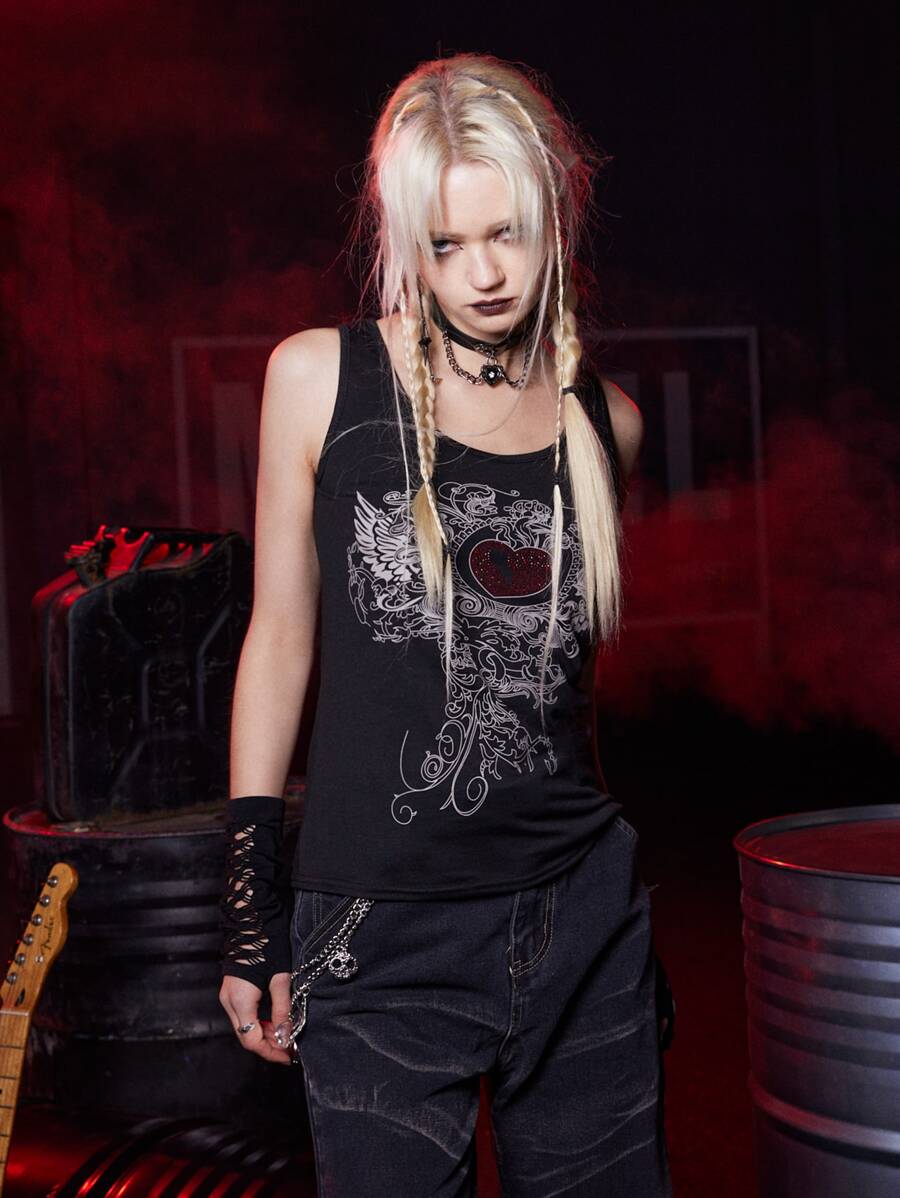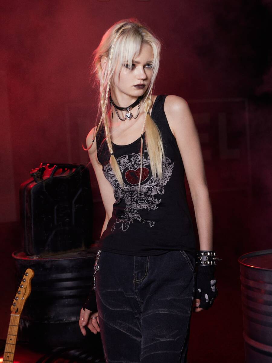 Grunge Punk لباس علوي تانك قلب حجر الراين