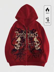Grunge Punk هودي بأكمام طويلة مطبوع عليه جمجمة حمراء، للمدرسة، للخريف والشتاء
