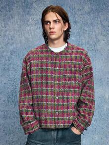Grunge Punk جاكيت كاجوال رجالية عصرية بنمط مربعات، بدون ياقة، من القماش الخشن، للخريف