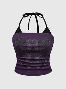 Grunge Punk ملابس علوية تانك عريضة الحجم مع طبعة جمجمة ملونة وياقة على شكل حرف V، مرنة وللنساء