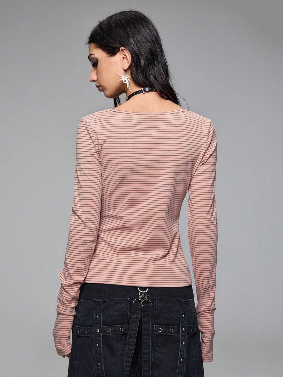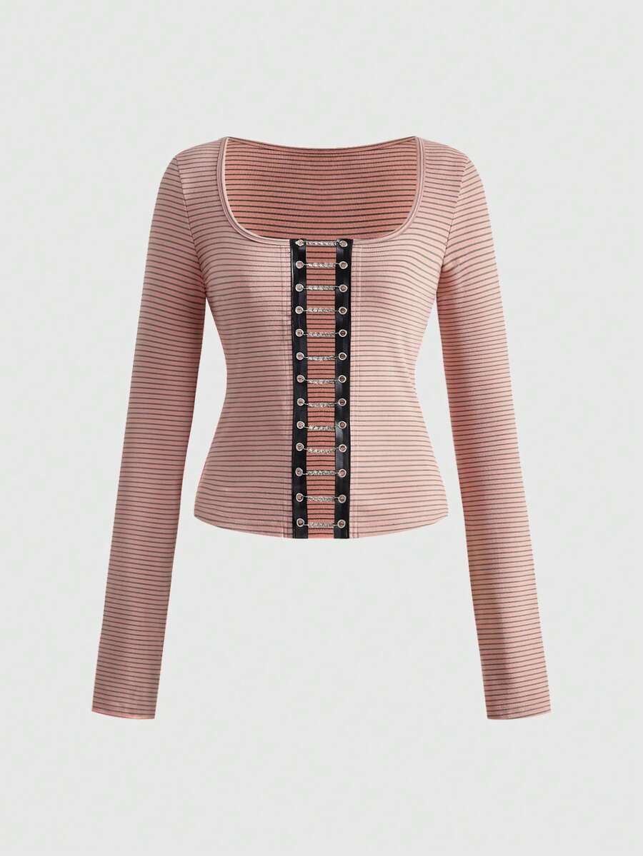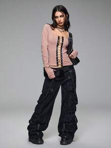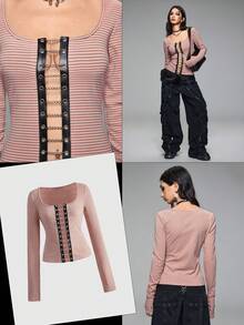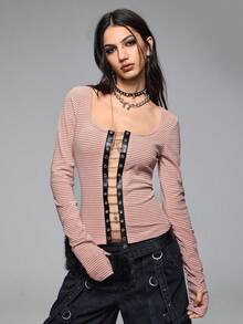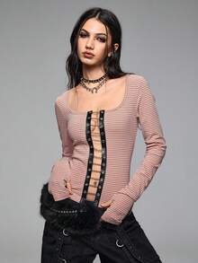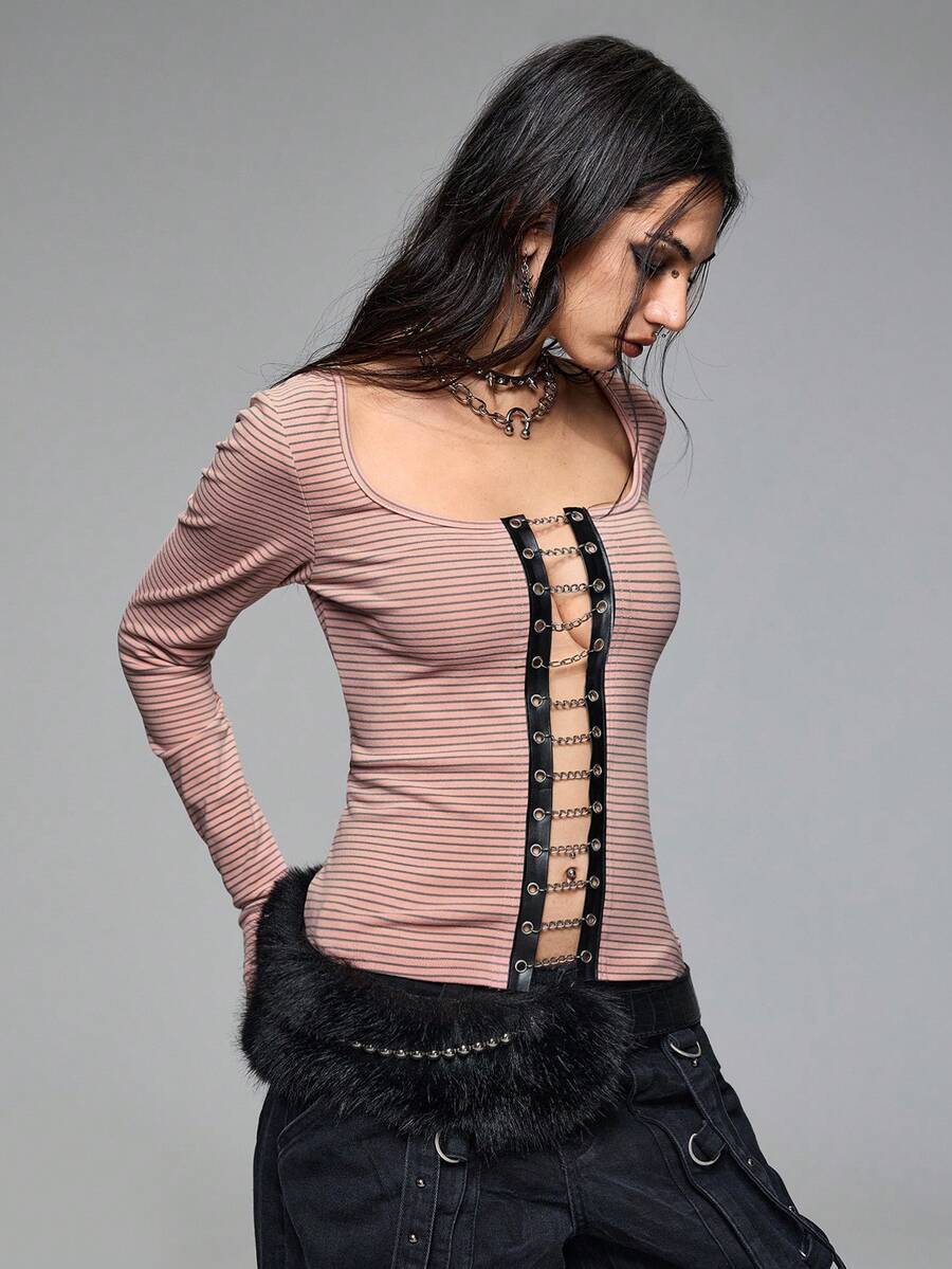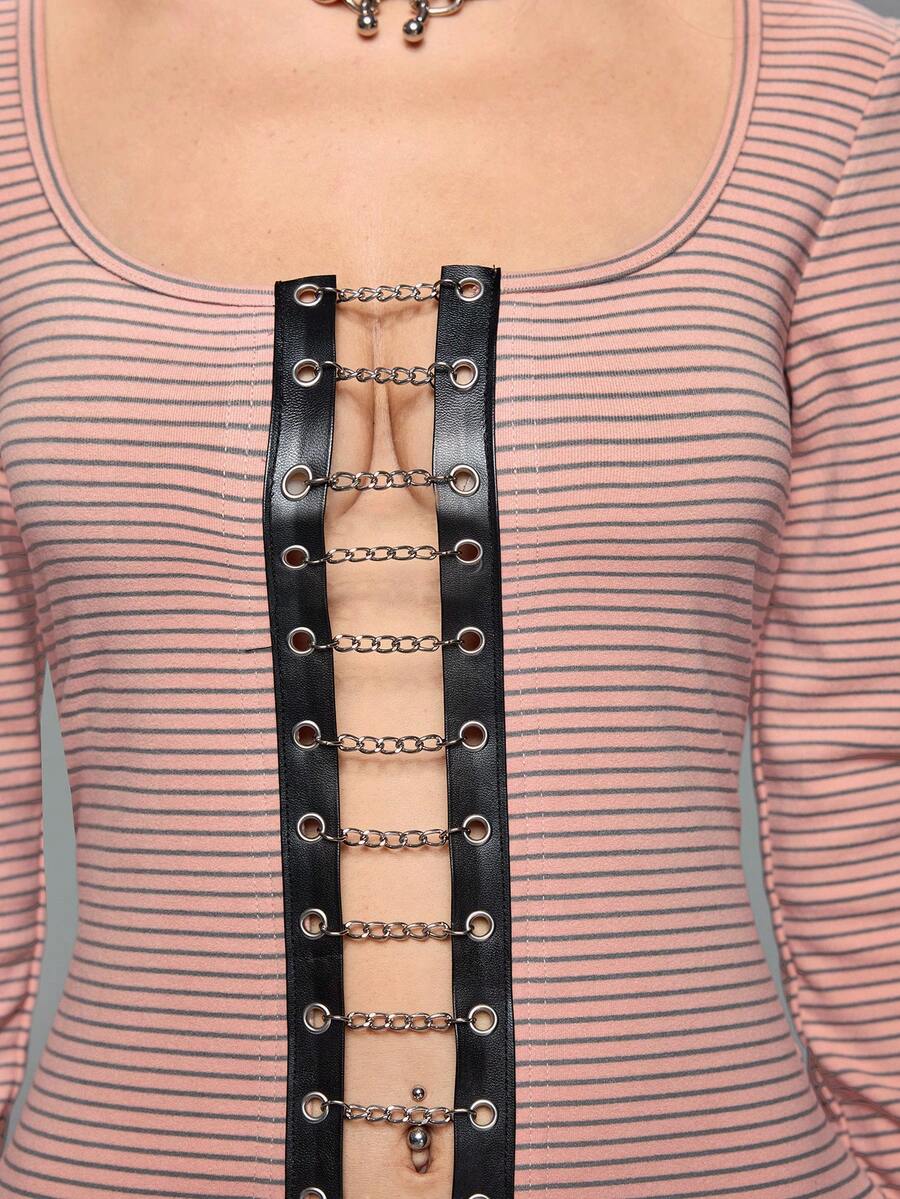 Grunge Punk ملابس علوية ضيقة بياقة طاقم مفرغة من الأمام، مصنوعة من قماش البولي يوريثان المرقع بخطوط سوداء ورمادية، مع سلسلة معدنية