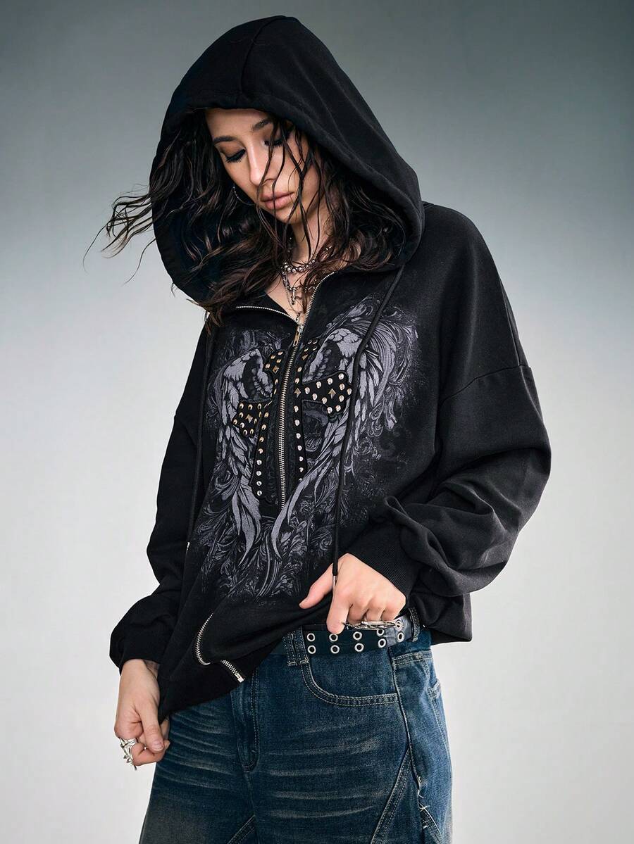 Grunge Punk هوديي من الفليس مزين بطبعة الحرف والجناح والبراغي للنساء بطراز بانك