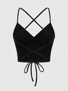 Grunge Punk توب كامي ضيق محصور بشريط متقاطع وياقة على شكل V للتداخل، لون أحادي بدون ظهر، للمدرسة