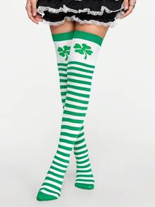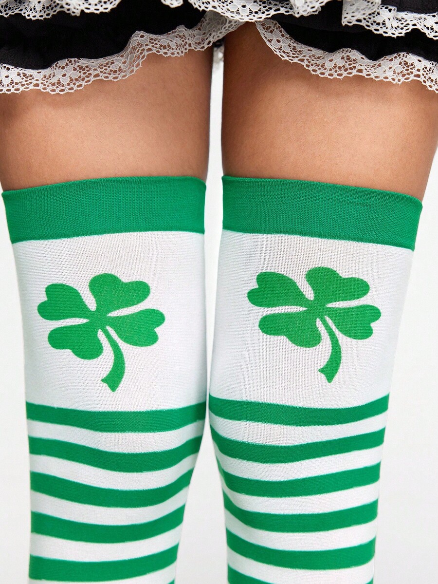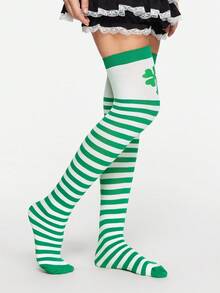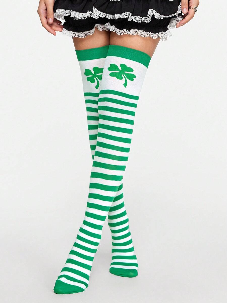 Grunge Punk جوارب طويلة فوق الركبة بطبعات عشوائية على شكل أوراق البرسيم المخططة، بأسلوب Y2K متعدد الاستخدامات، مناسبة للحفلات والتجمعات والمناسبات الاجتماعية