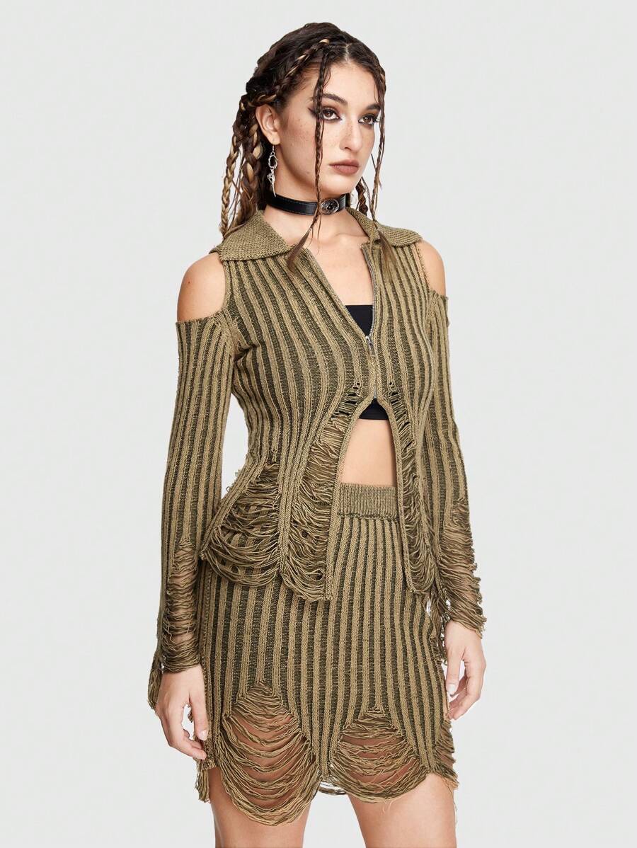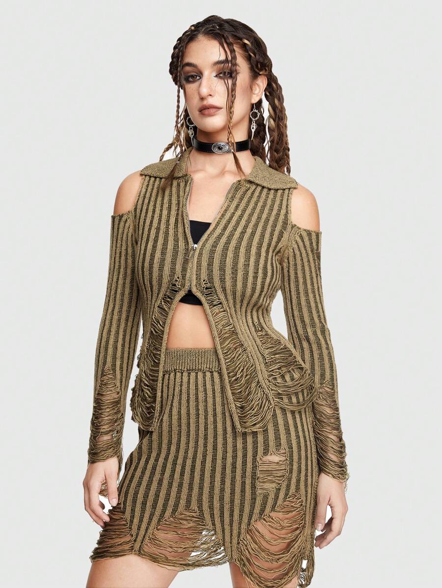 Grunge Punk كارديجان نمط مخطط كتف مكشوف مهشم